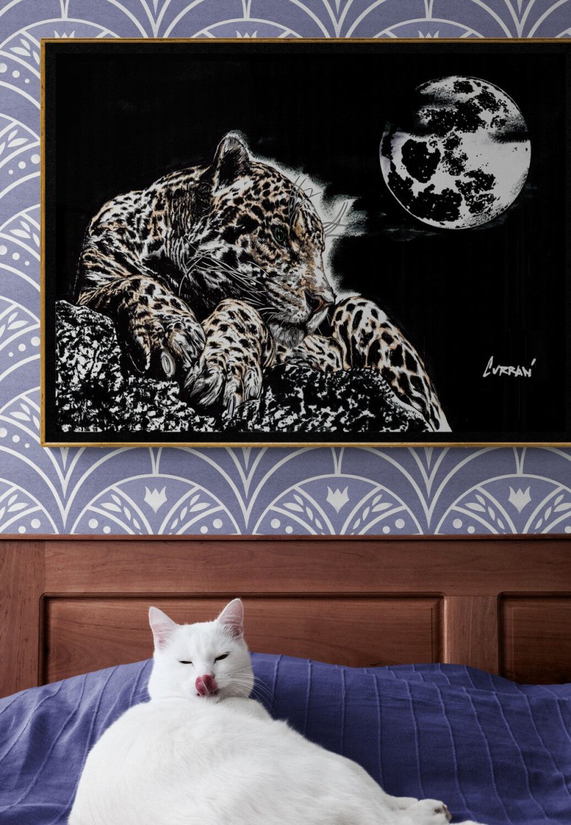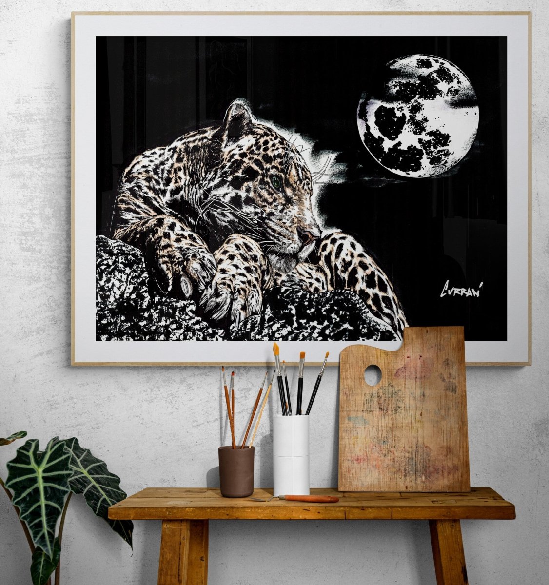 Drawn entirely by hand by artist Kris Curran, this artwork reveals the intricate patterns of the leopard’s coat, its intense gaze, and the raw presence that makes it one of the most admired big cats in the world. Each stroke brings out the personality and mystique of this elusive predator, creating a striking centerpiece for any space.