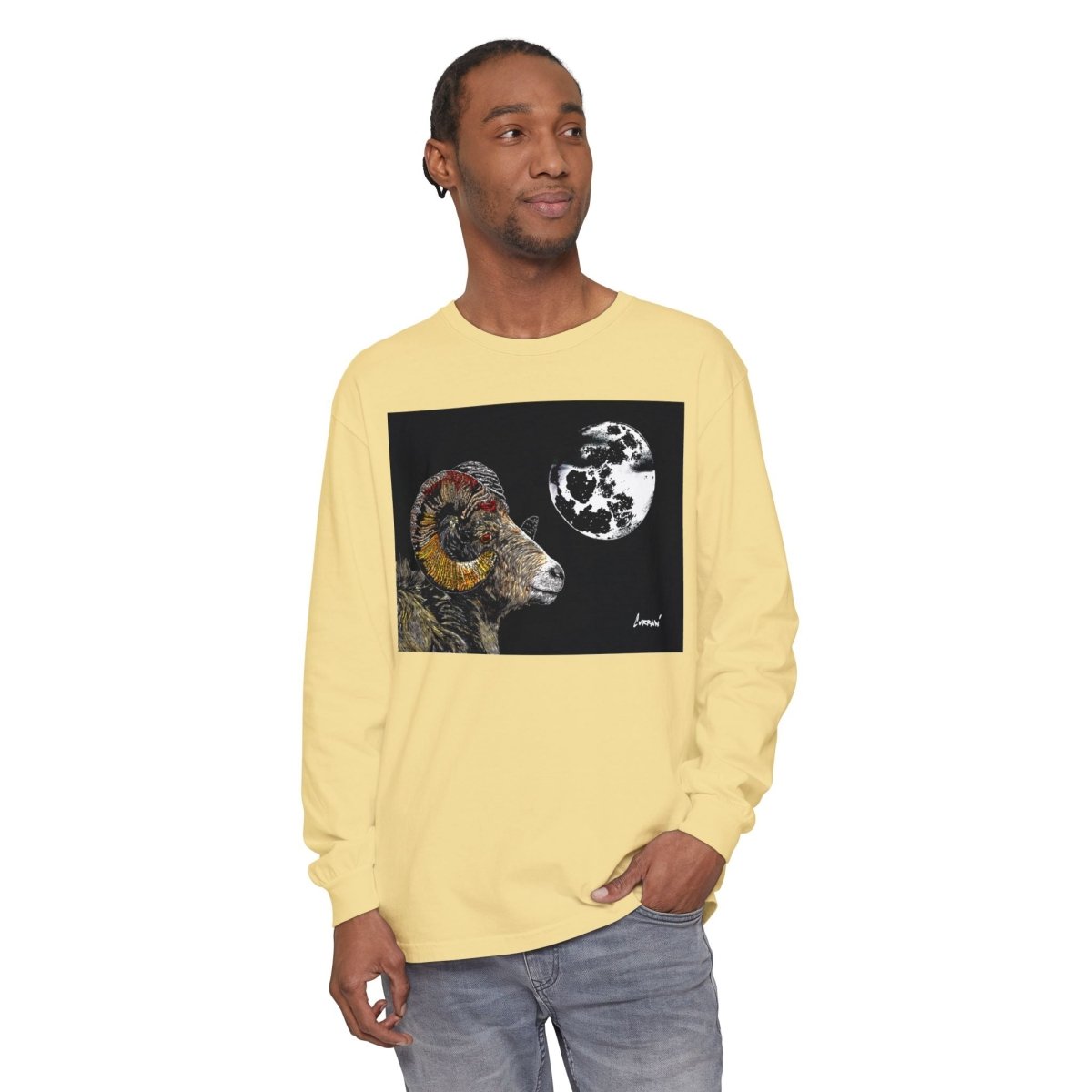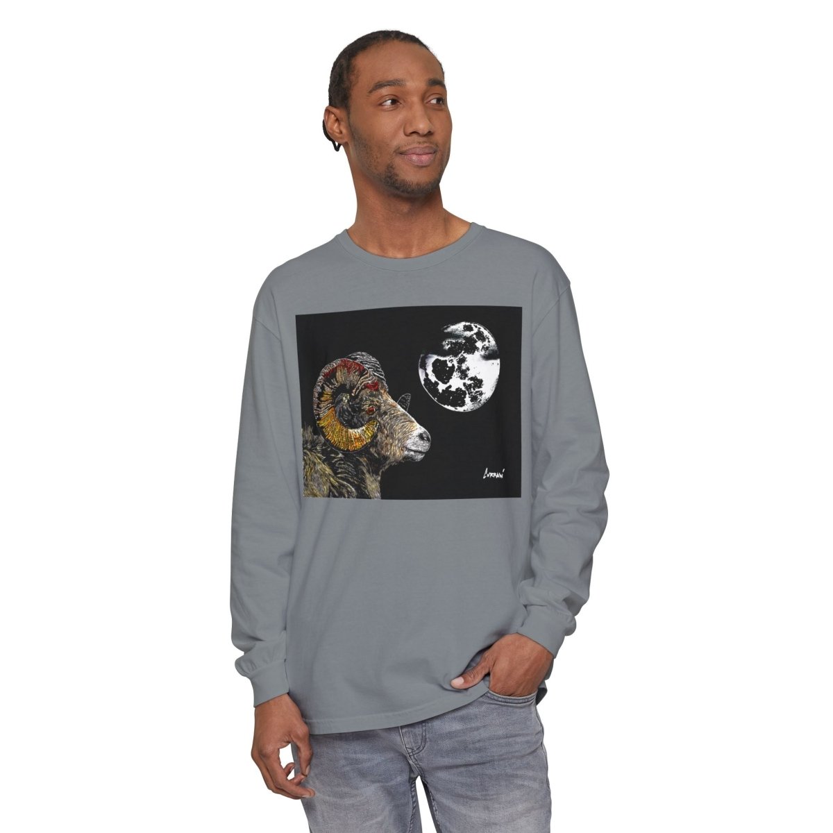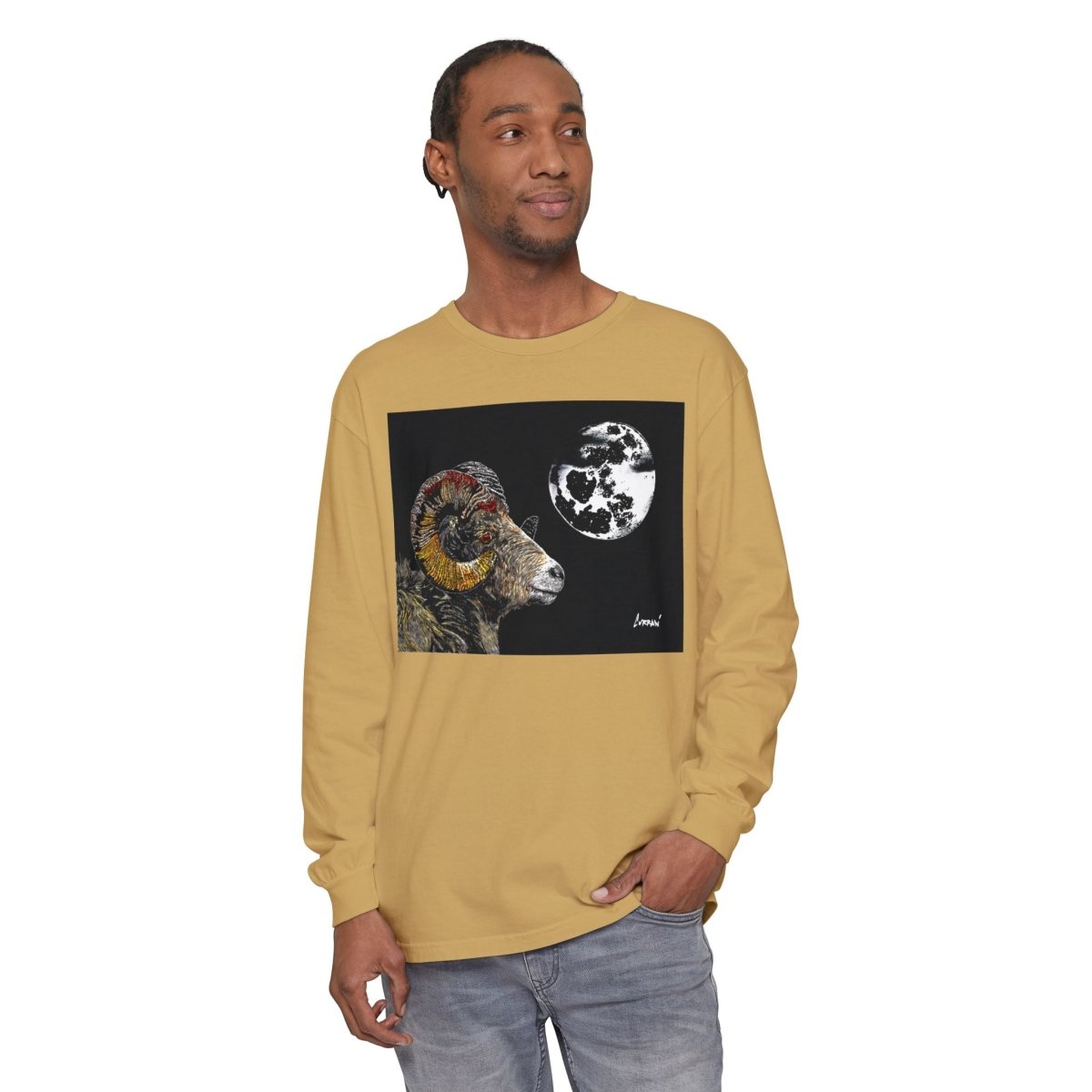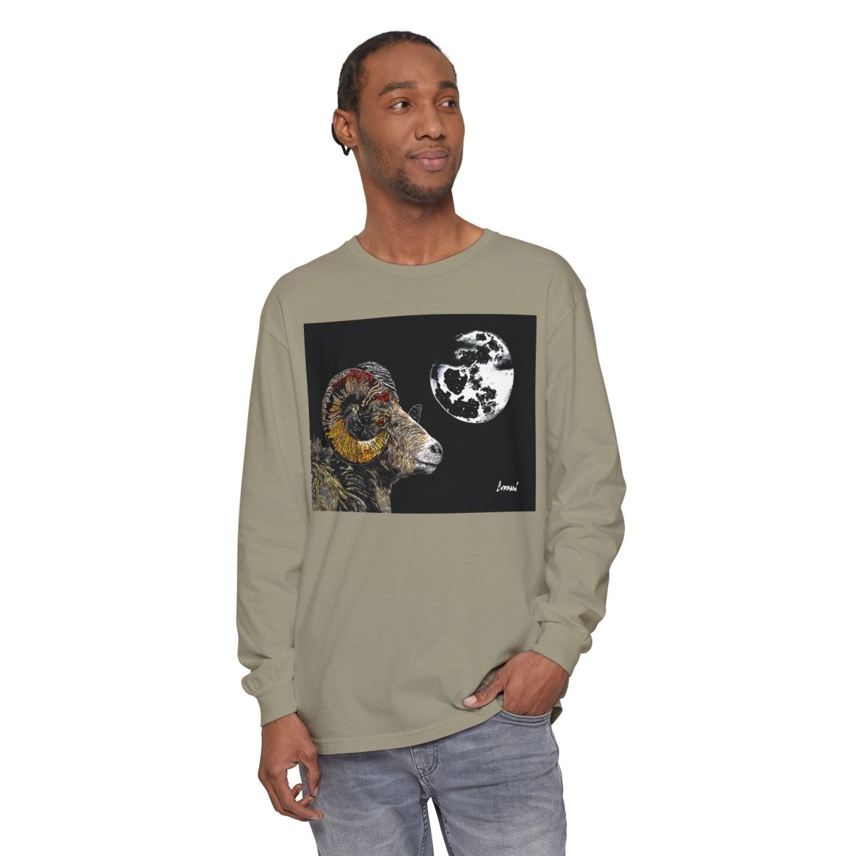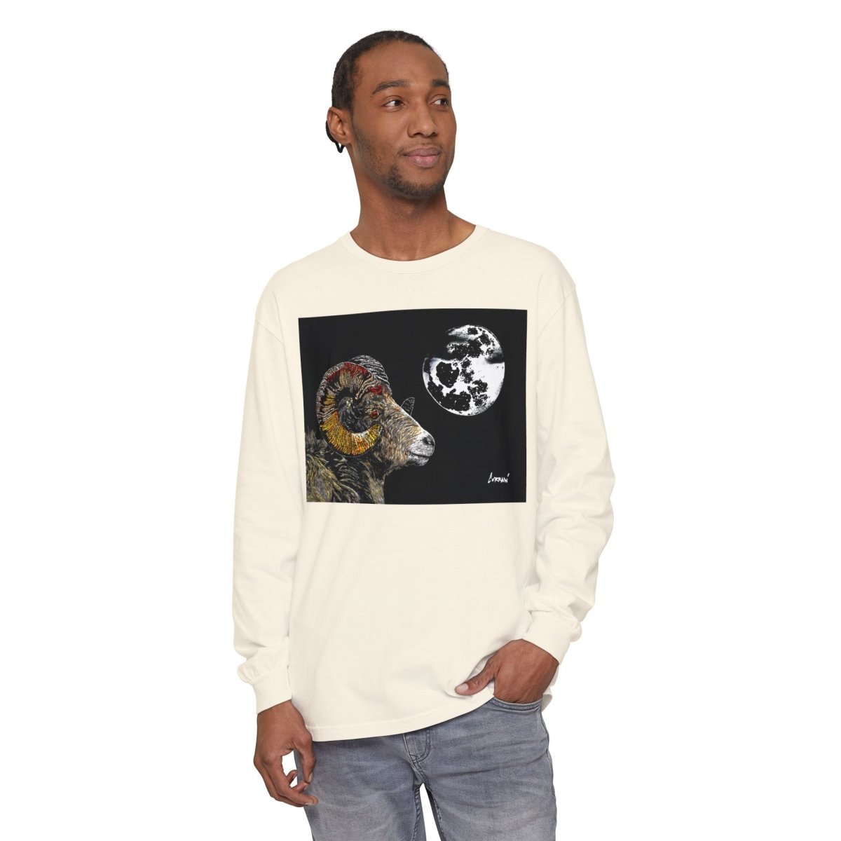 Elevate your style with Ram Long Sleeve T-Shirt - Unique Garment-Dyed Style. Embrace the distinct look! Featuring original hand drawn wall art by Kris Curran