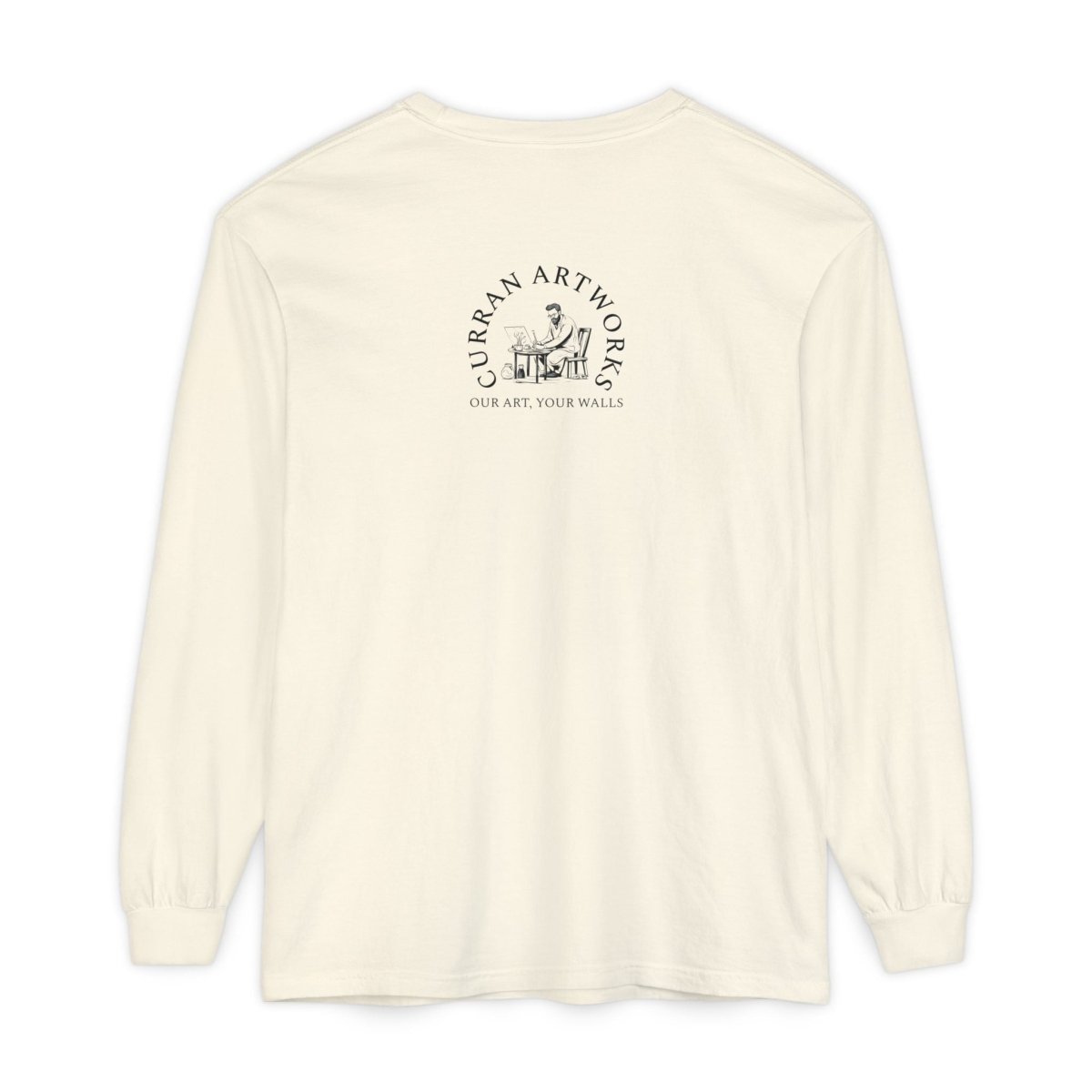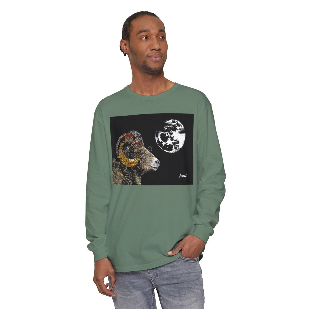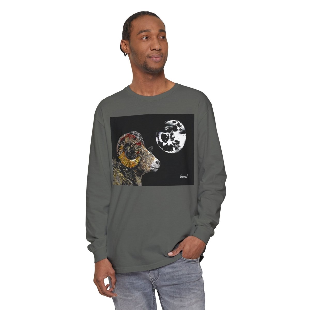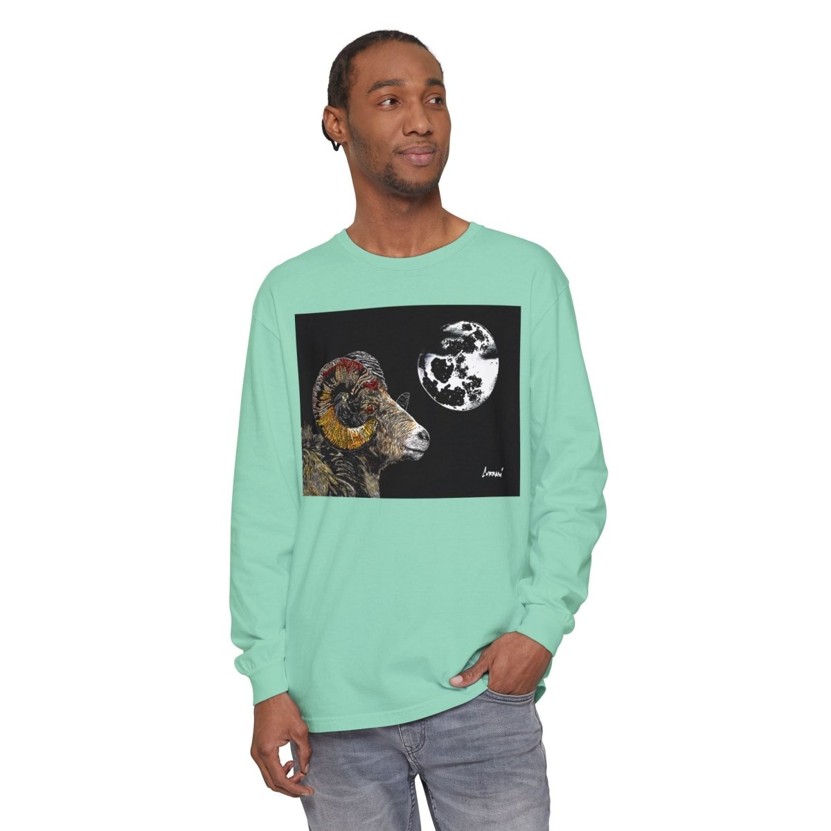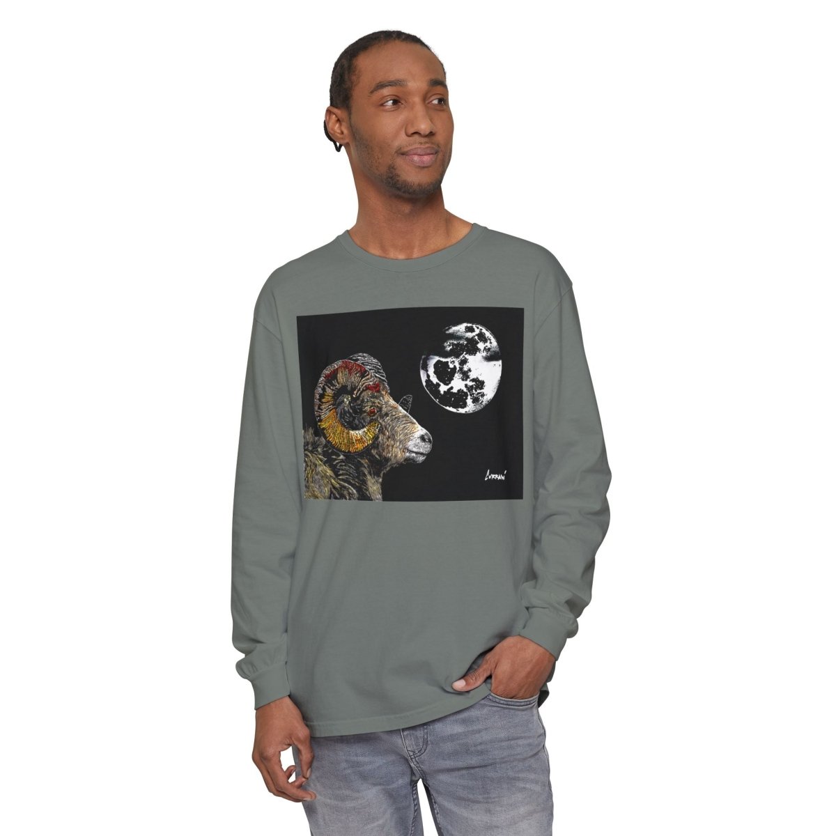Elevate your style with Ram Long Sleeve T-Shirt - Unique Garment-Dyed Style. Embrace the distinct look! Featuring original hand drawn wall art by Kris Curran