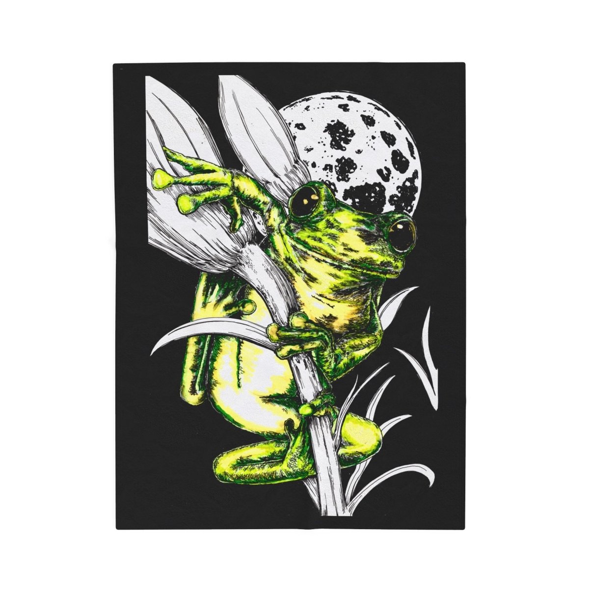 Frog Moon Velveteen Plush Blanket Cozy and Unique Home Decor depicting original hand drawn wall art by Kris Curran at Curran Artworks.