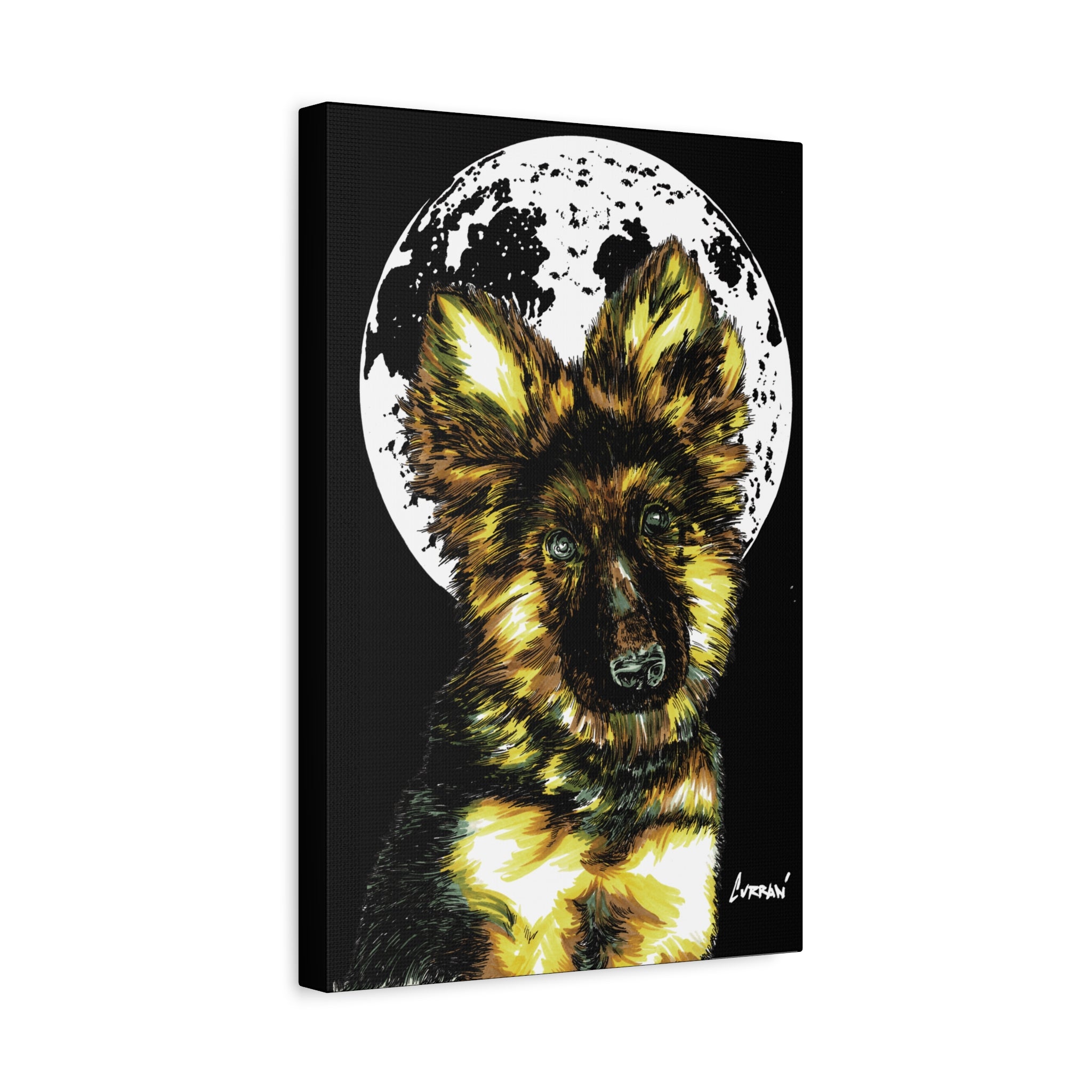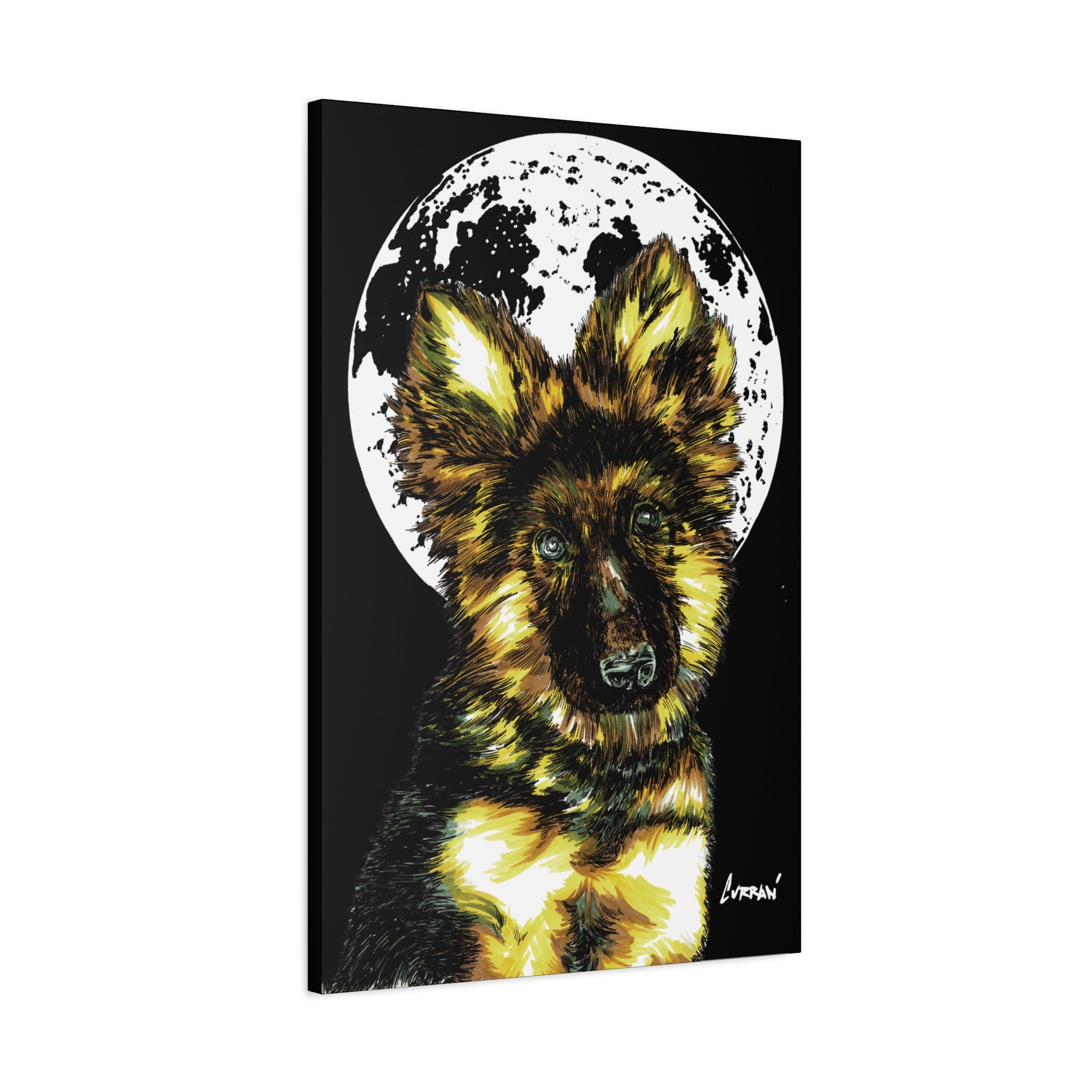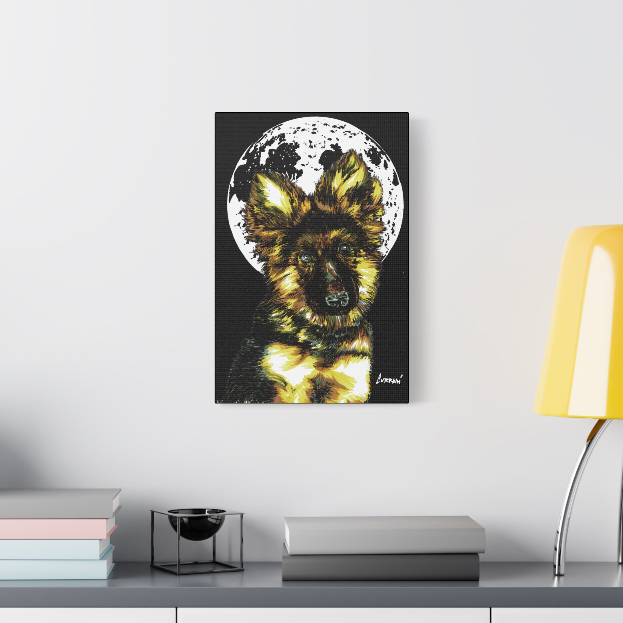 German Shepherd Puppy Print, Hand-Drawn Dog Art, Moonlight Wall Decor, Printed on Matte Canvas, Stretched, 1.25". Perfect Birthday or Christmas gift.