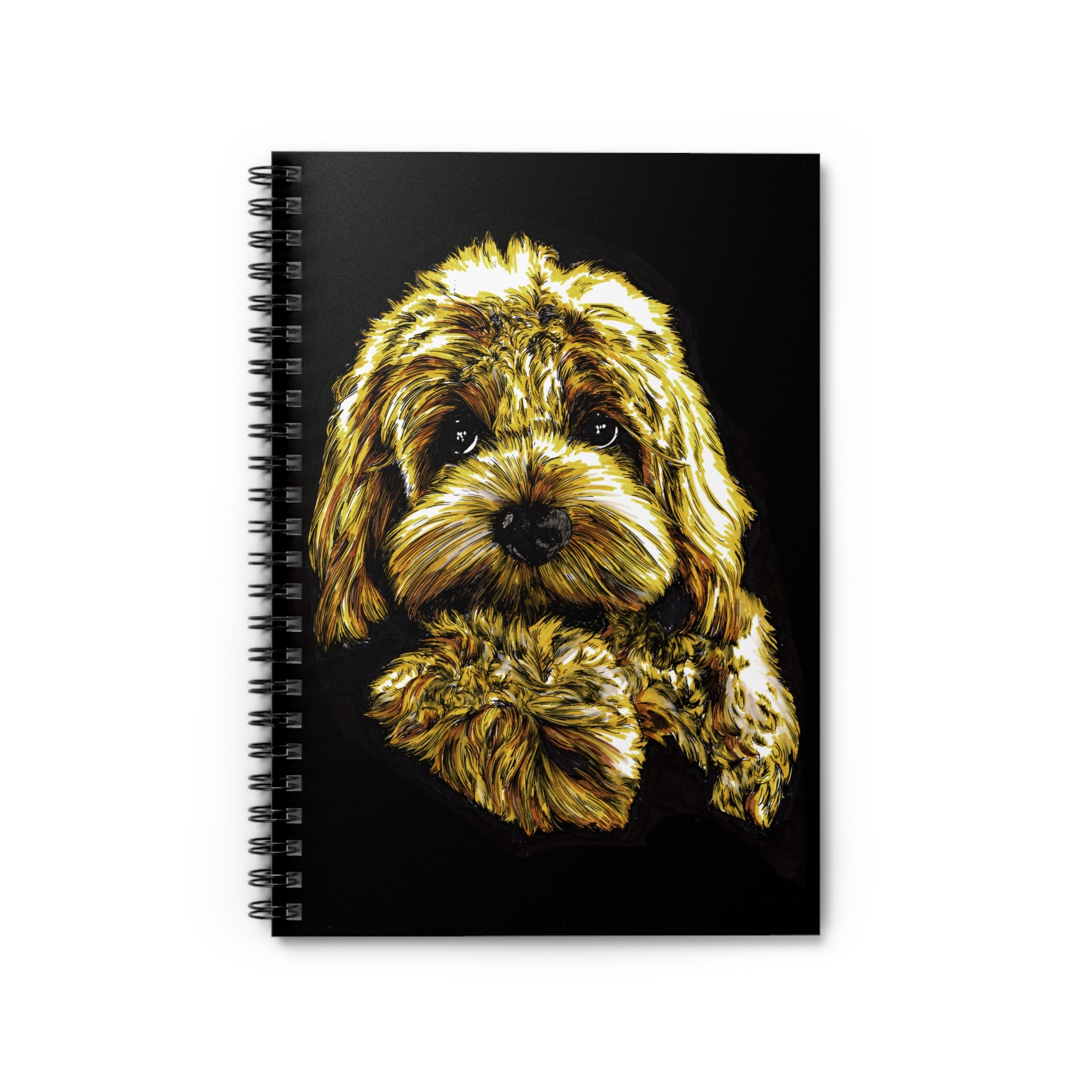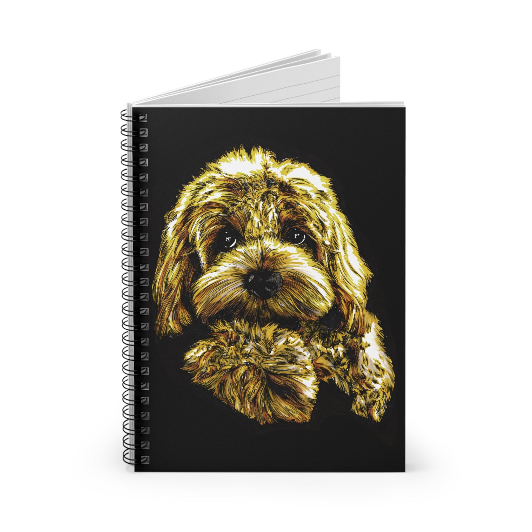 Goldendoodle Spiral Notebook - Ruled Line featuring the original hand drawn animal/pet wall art by Kris Curran Canadian artist at Curran Artworks. A charming Spiral Notebook featuring original hand-drawn art of Da Goldendoodle. Perfect for dog lovers and art enthusiasts, this notebook adds a touch of whimsy to your everyday note taking. Ideal for jotting down thoughts, to-do lists, and journal entries. Great for back to school, birthdays, and holiday gifts.