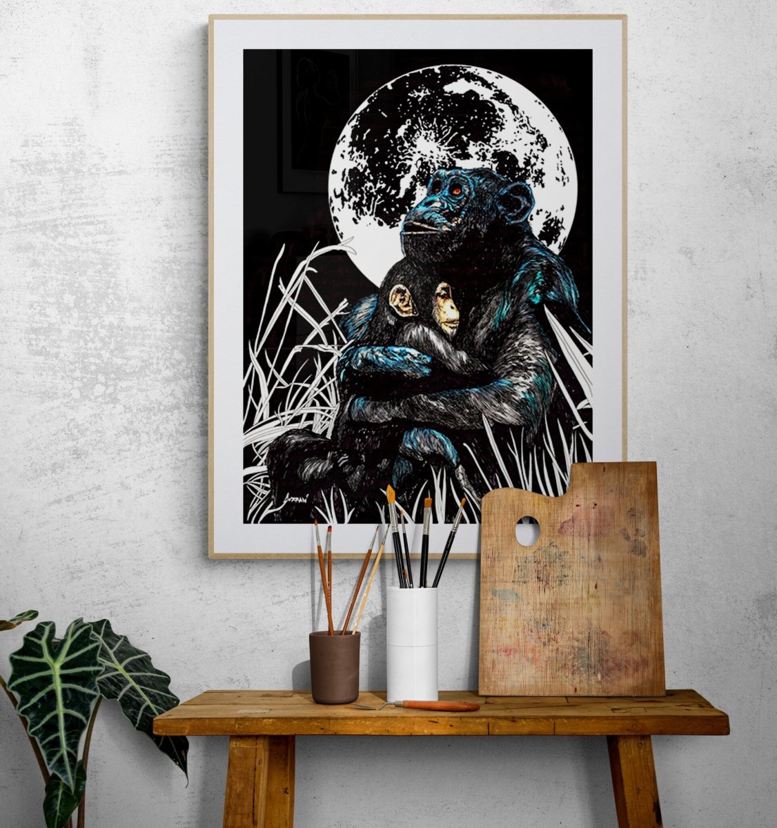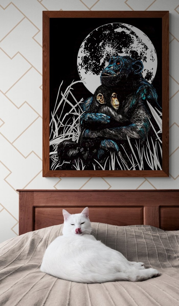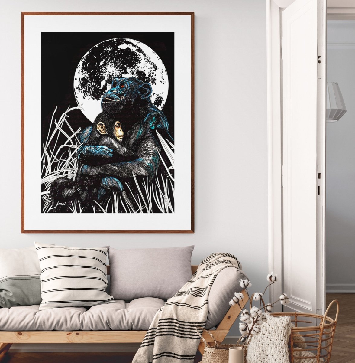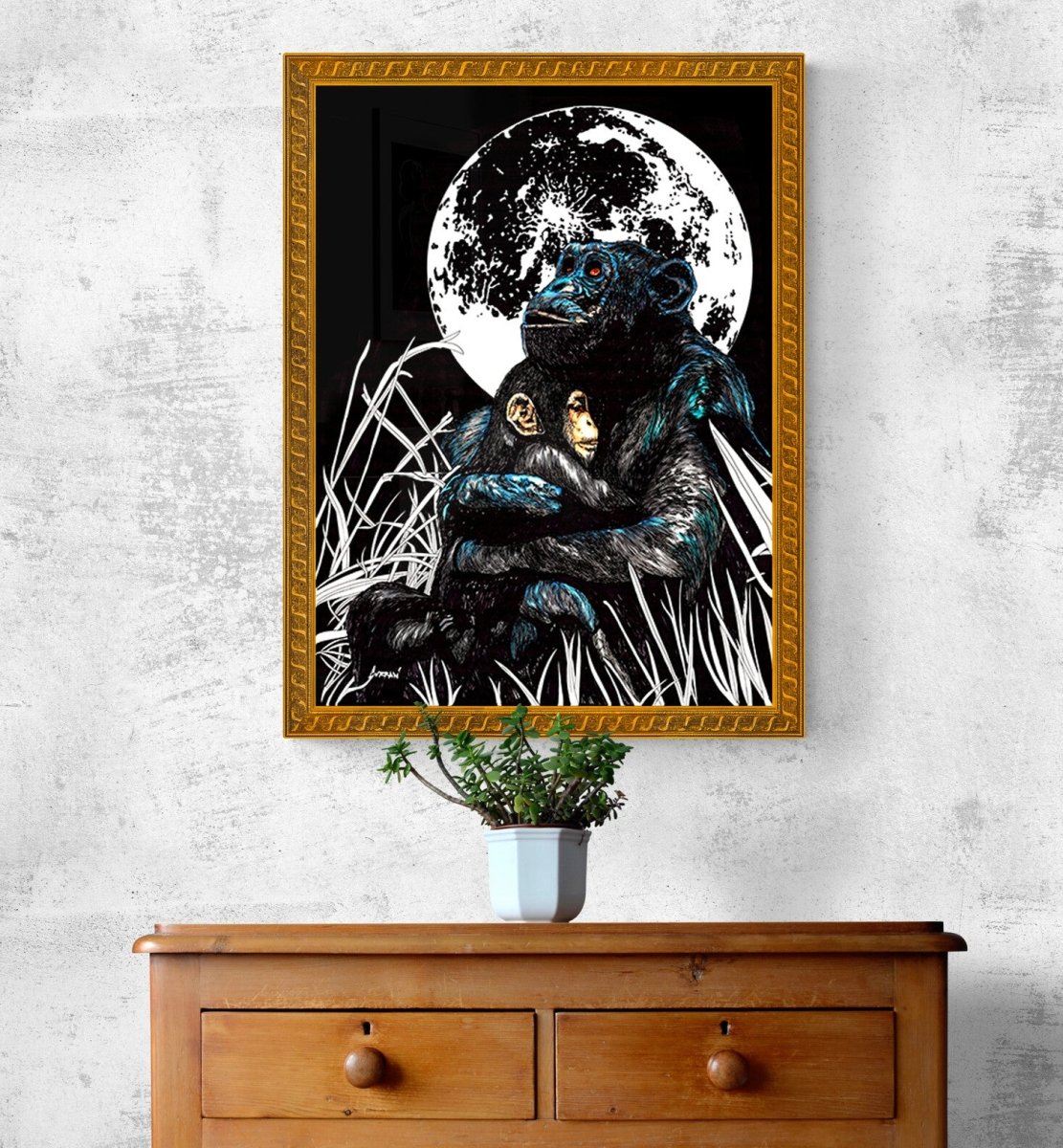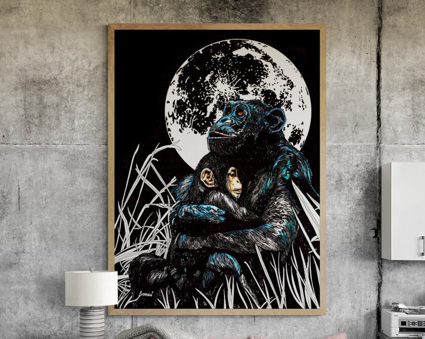 Explore the profound connection between strength and tenderness with Bond of Giants, a 22" x 30" original hand-drawn wall art poster by Artist Kris Curran at Curran Artworks. This evocative piece captures a powerful moment shared between a majestic gorilla and its child, rendered with exquisite detail on smooth Bristol board paper using India ink pens and vibrant Copic alcohol ink pens.