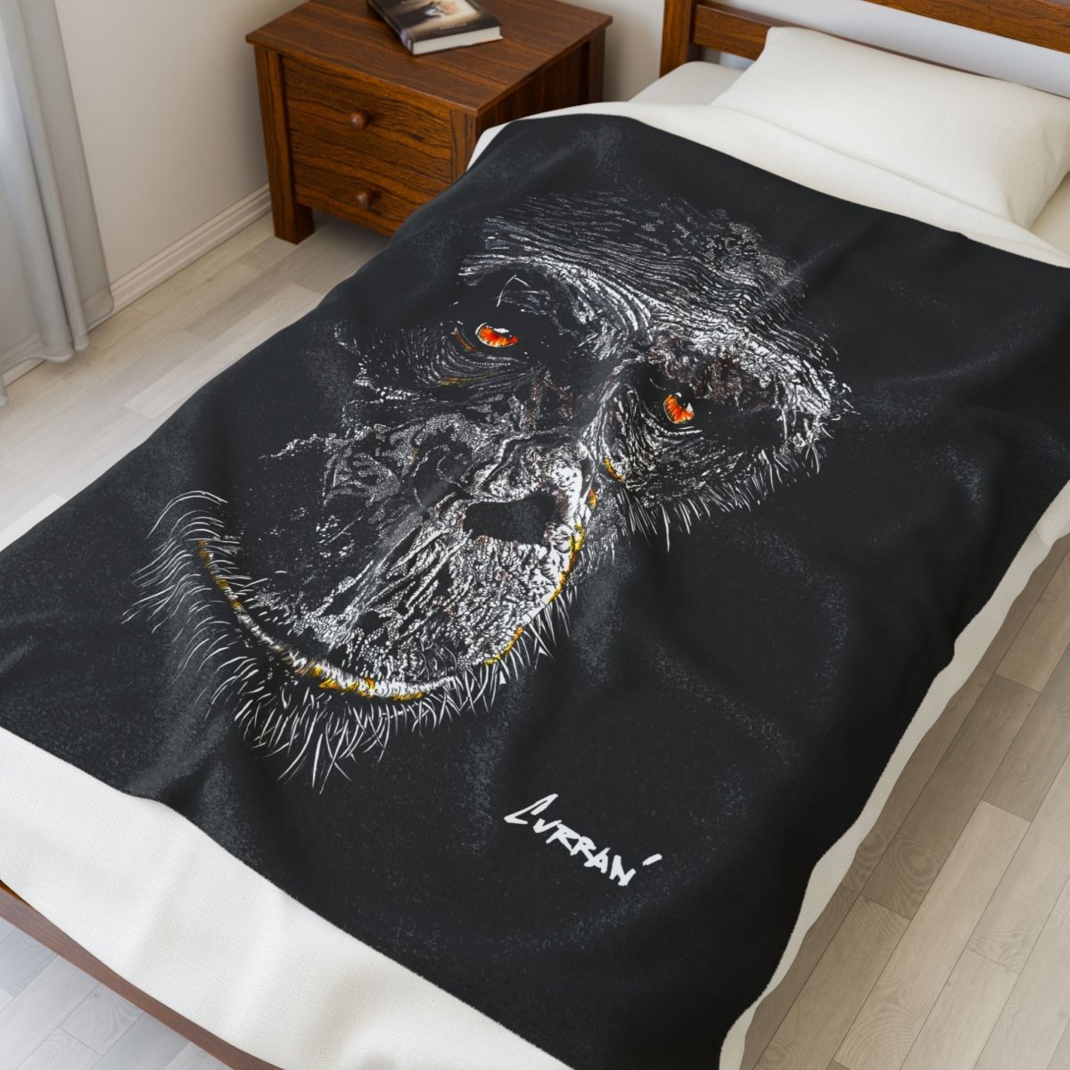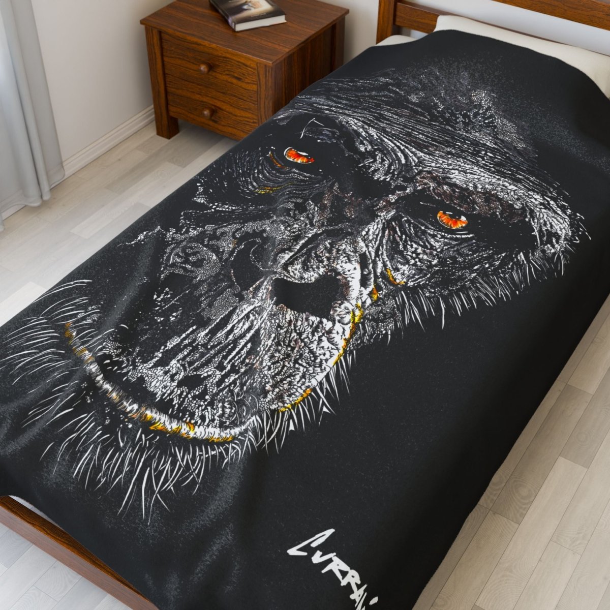 Gorilla Face Velveteen Plush Blanket Soft Cozy Animal Throw depicting original hand drawn wall art by Curran Artworks artist Kris Curran.