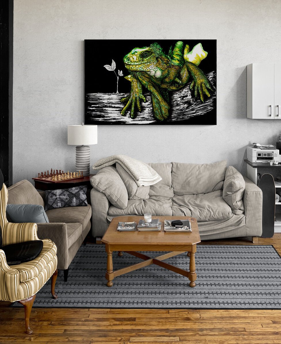 Bring a splash of reptilian character to your space with this original hand-drawn Iguana, now available as a high-resolution digital download from Curran Artworks. Created by Canadian artist Kris Curran, this intricate piece captures the bold texture, scales, and captivating stare of this exotic creature.