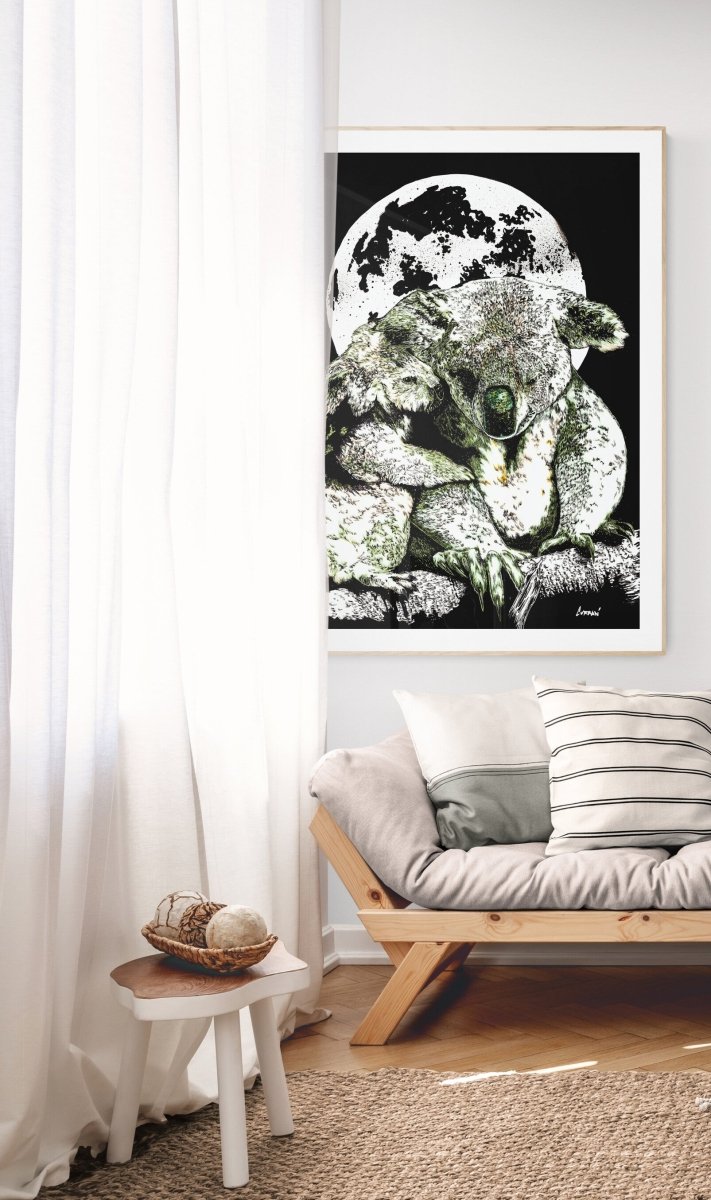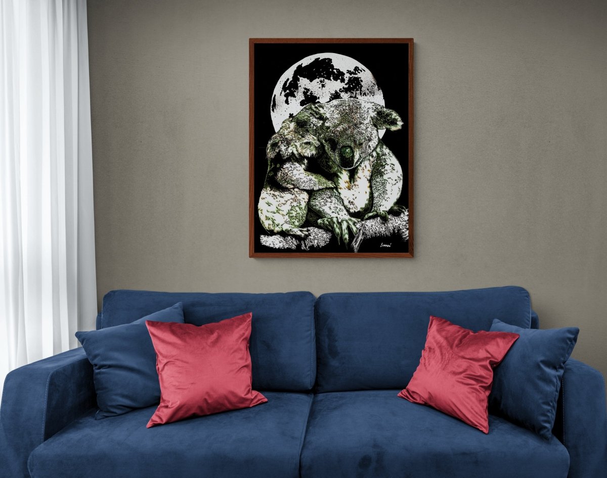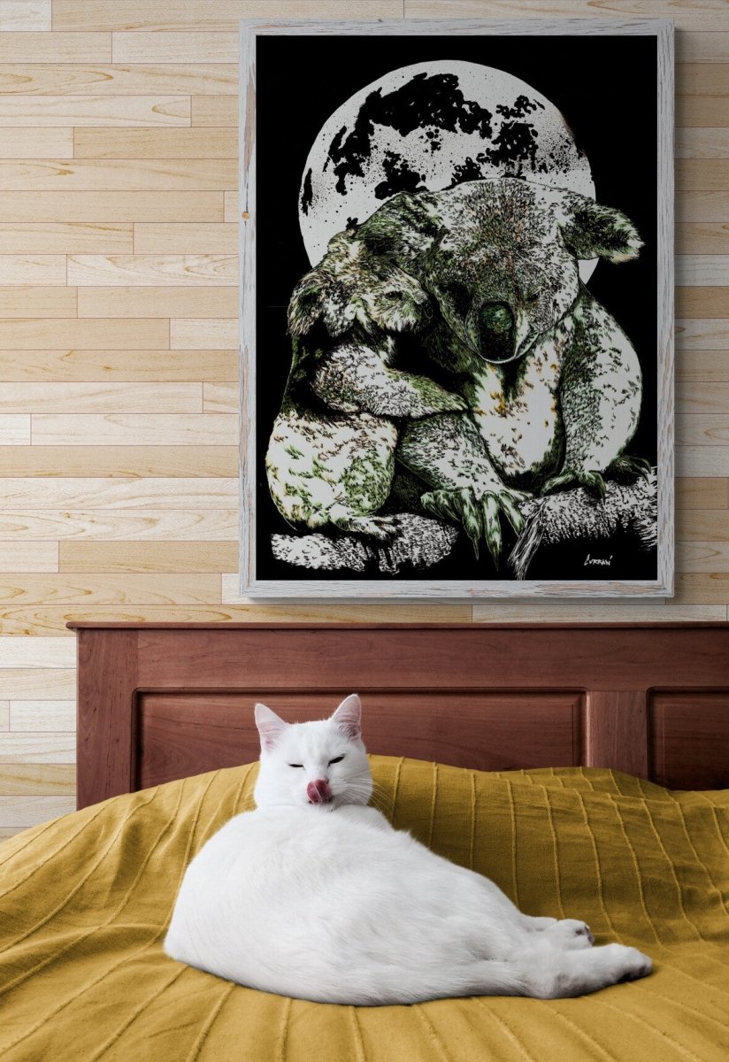 Kris Curran’s artistic attention to detail captures not just the physical appearance of these beloved marsupials, but also their emotional resonance—the quiet communication and connection shared between them. The piece radiates calm, affection, and a deep reverence for wildlife.