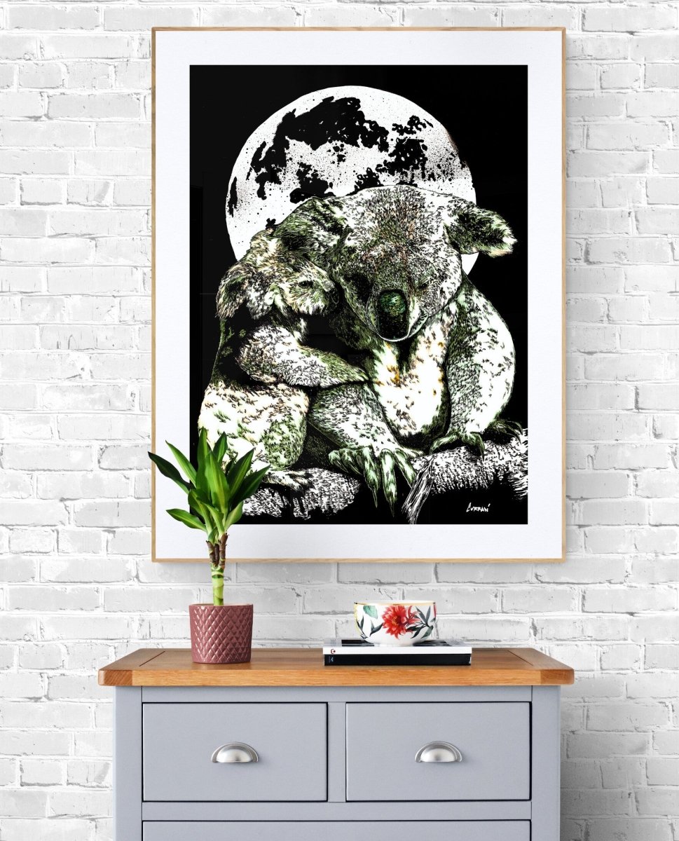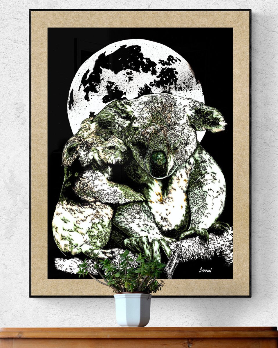 Kindred Climb is a heartwarming 22" x 30" original hand-drawn wall art poster by Artist Kris Curran of Curran Artworks, capturing the gentle bond between two koalas nestled together among the eucalyptus branches. Created with precision using India ink pen and Copic alcohol-colored ink pens on premium Bristol board paper, this one-of-a-kind piece is a celebration of tenderness, nature, and connection.