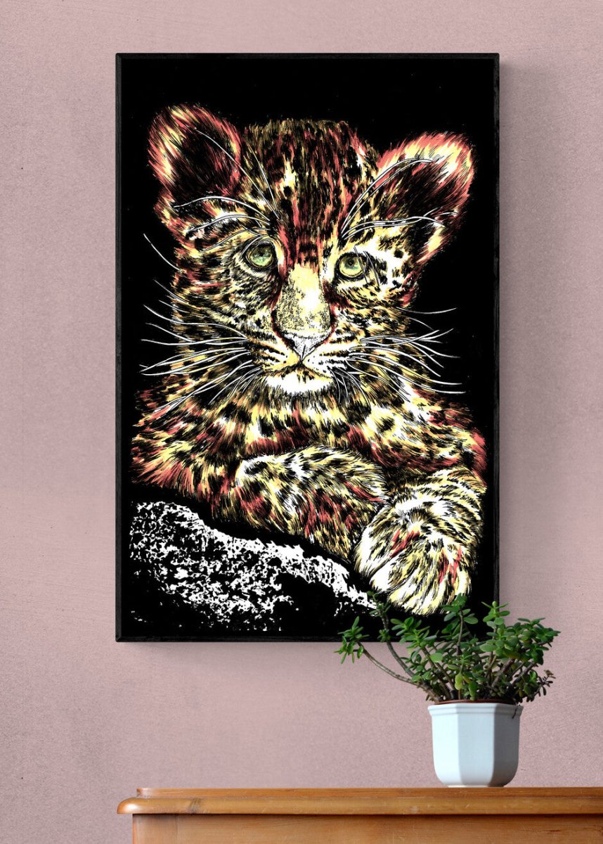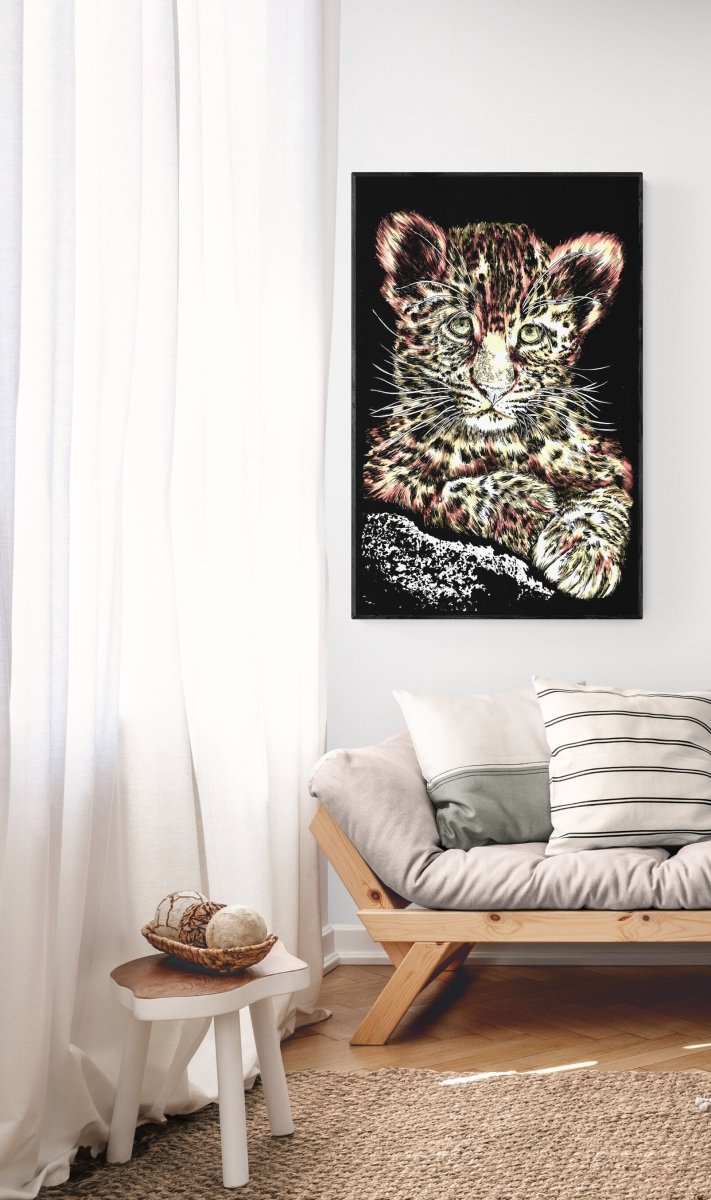 Step into the untamed beauty of the wild with this original hand-drawn wall art poster by Artist Kris Curran, from Curran Artworks, featuring a captivating leopard cub. Drawn with precision using India ink and brought to life with the rich, expressive tones of Copic alcohol ink pens on smooth Bristol board, this piece radiates the delicate balance of innocence and instinct. The leopard cub’s watchful eyes and soft, spotted coat are rendered with exquisite detail, celebrating the quiet strength and wonder of nature’s most graceful creatures. A perfect piece for wildlife lovers and collectors of soulful, original art.