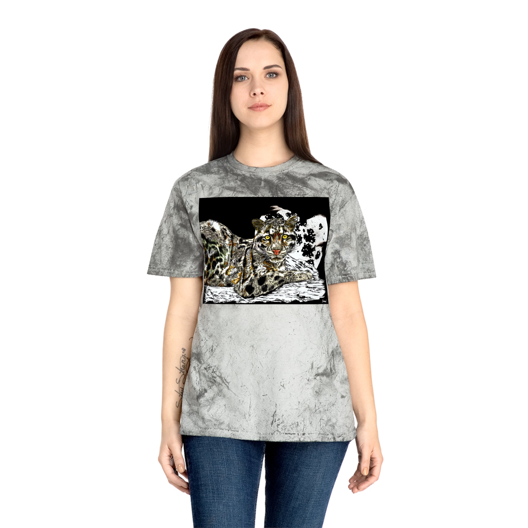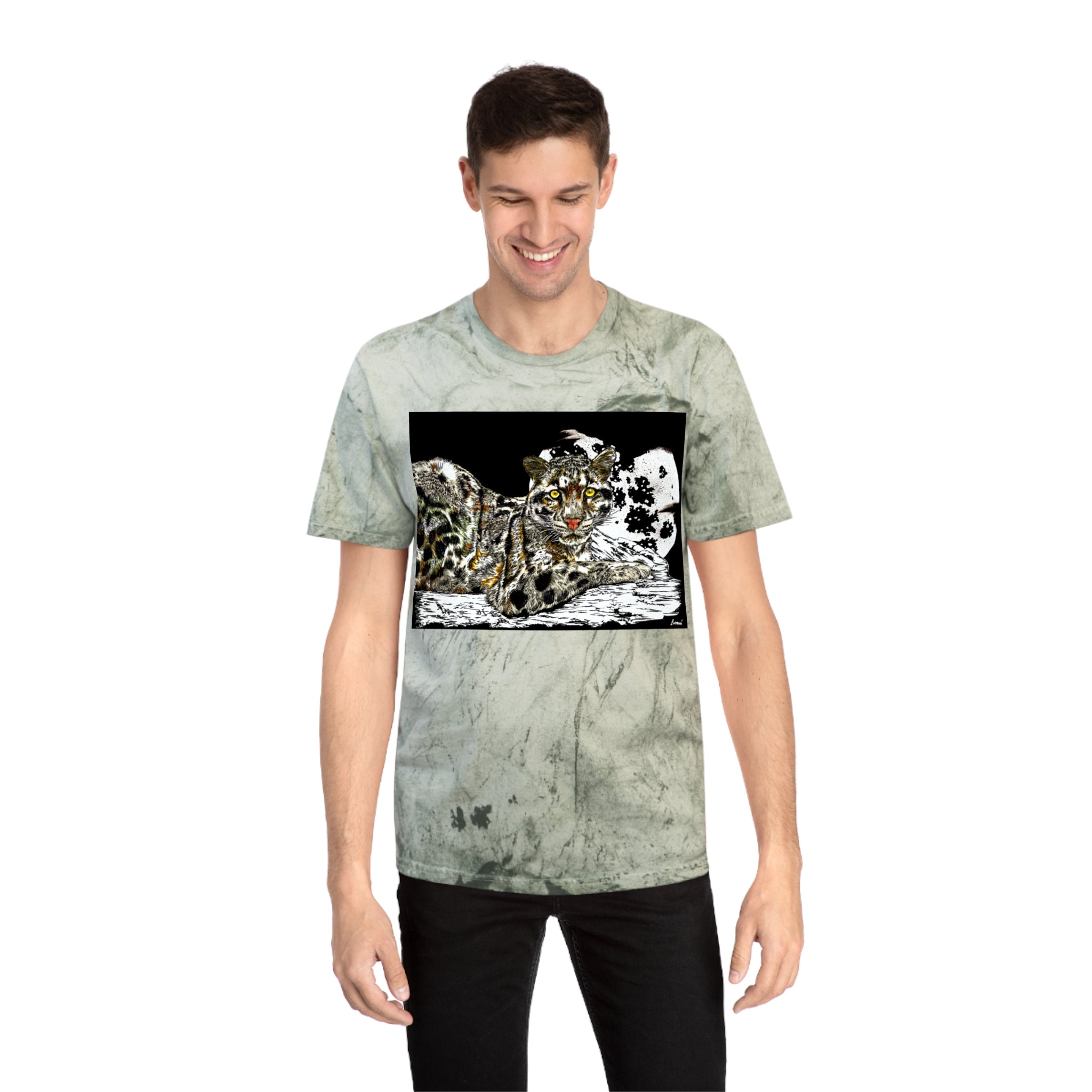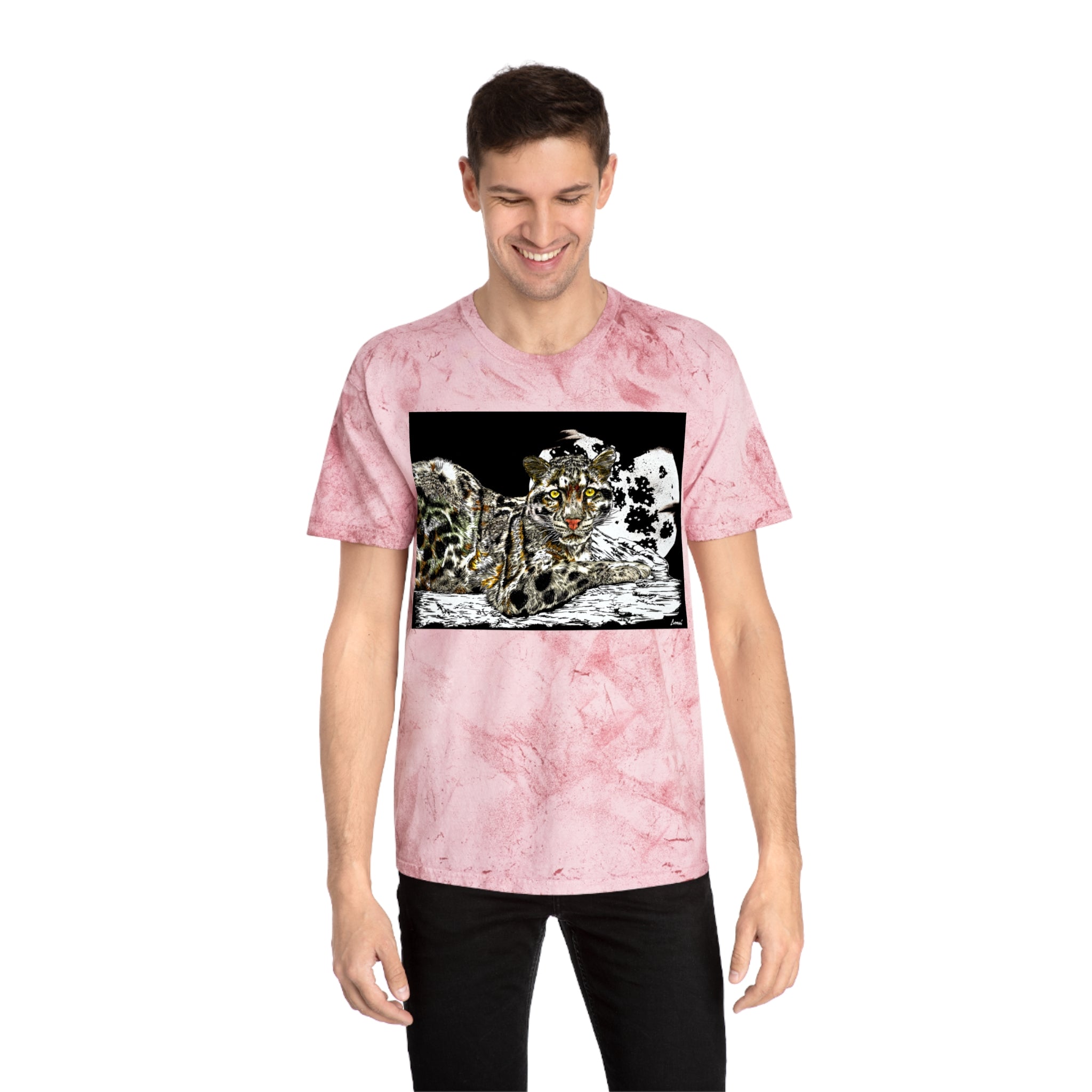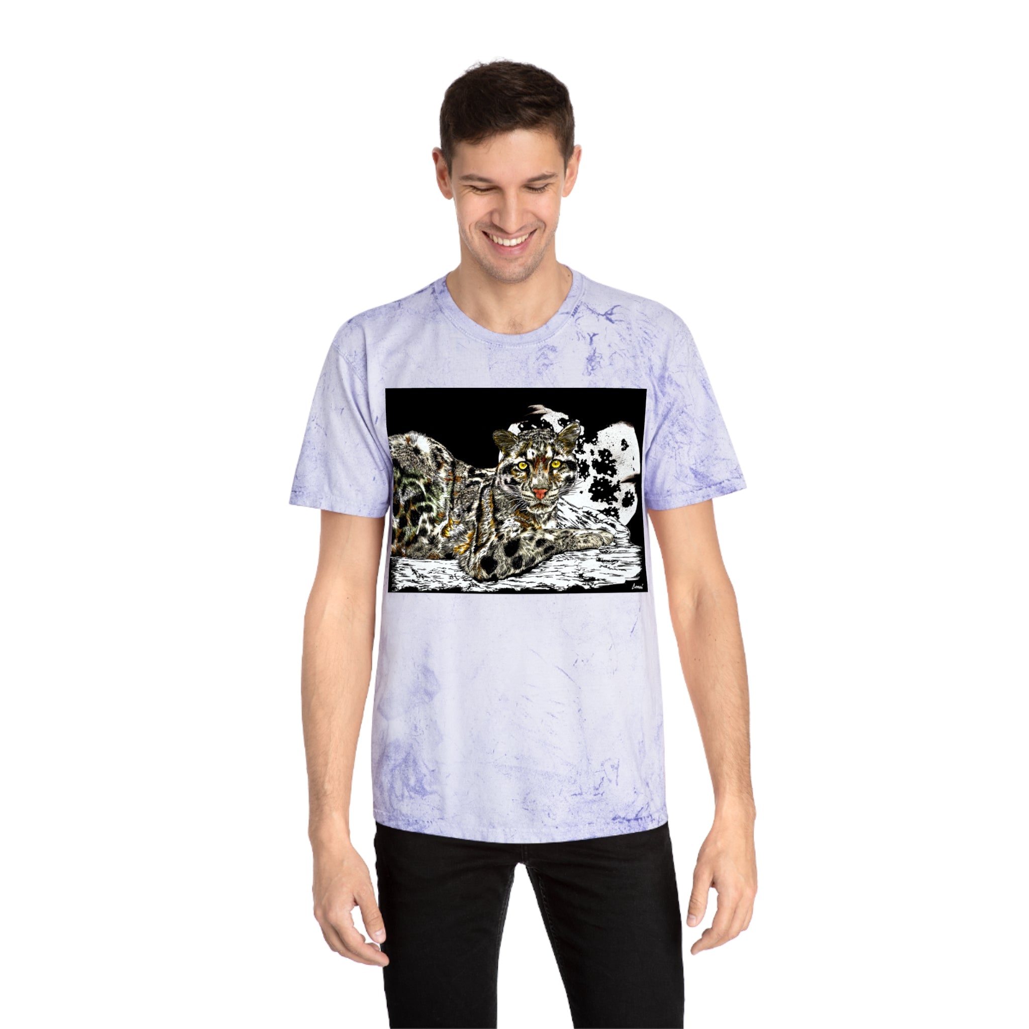 Leopard in the Moonlight Color Blast T-Shirt featuring original hand-drawn art by Kris Curran at Curran Artworks. This unique and vibrant shirt is perfect for those who appreciate artistic designs and want to stand out in a crowd. Ideal for animal lovers and art enthusiasts. Suitable for casual wear, art events, and nature-themed occasions.
