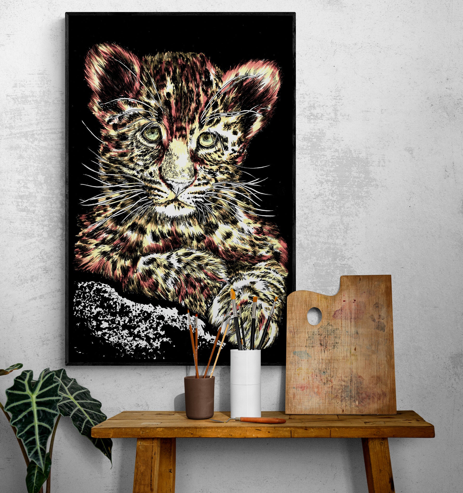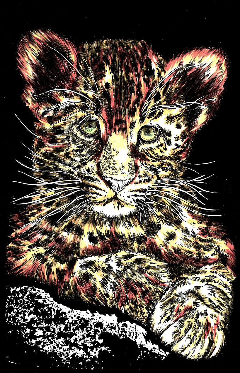 Step into the untamed beauty of the wild with this original 11" x 17" hand-drawn wall art poster by Artist Kris Curran, from K. B Art Collections, featuring a captivating leopard cub. Drawn with precision using India ink and brought to life with the rich, expressive tones of Copic alcohol ink pens on smooth Bristol board, this piece radiates the delicate balance of innocence and instinct. The leopard cub’s watchful eyes and soft, spotted coat are rendered with exquisite detail, celebrating the quiet strength and wonder of nature’s most graceful creatures. A perfect piece for wildlife lovers and collectors of soulful, original art.
