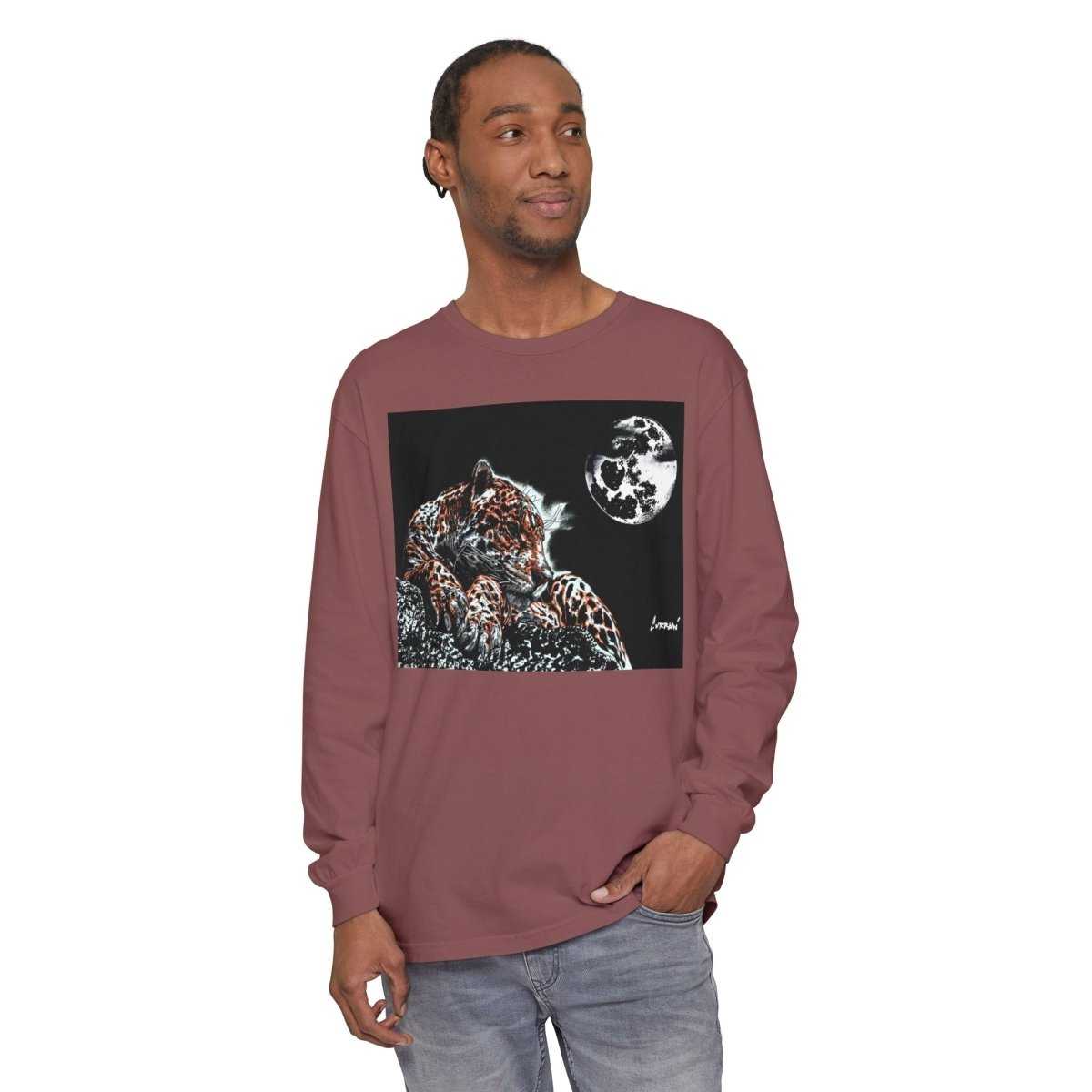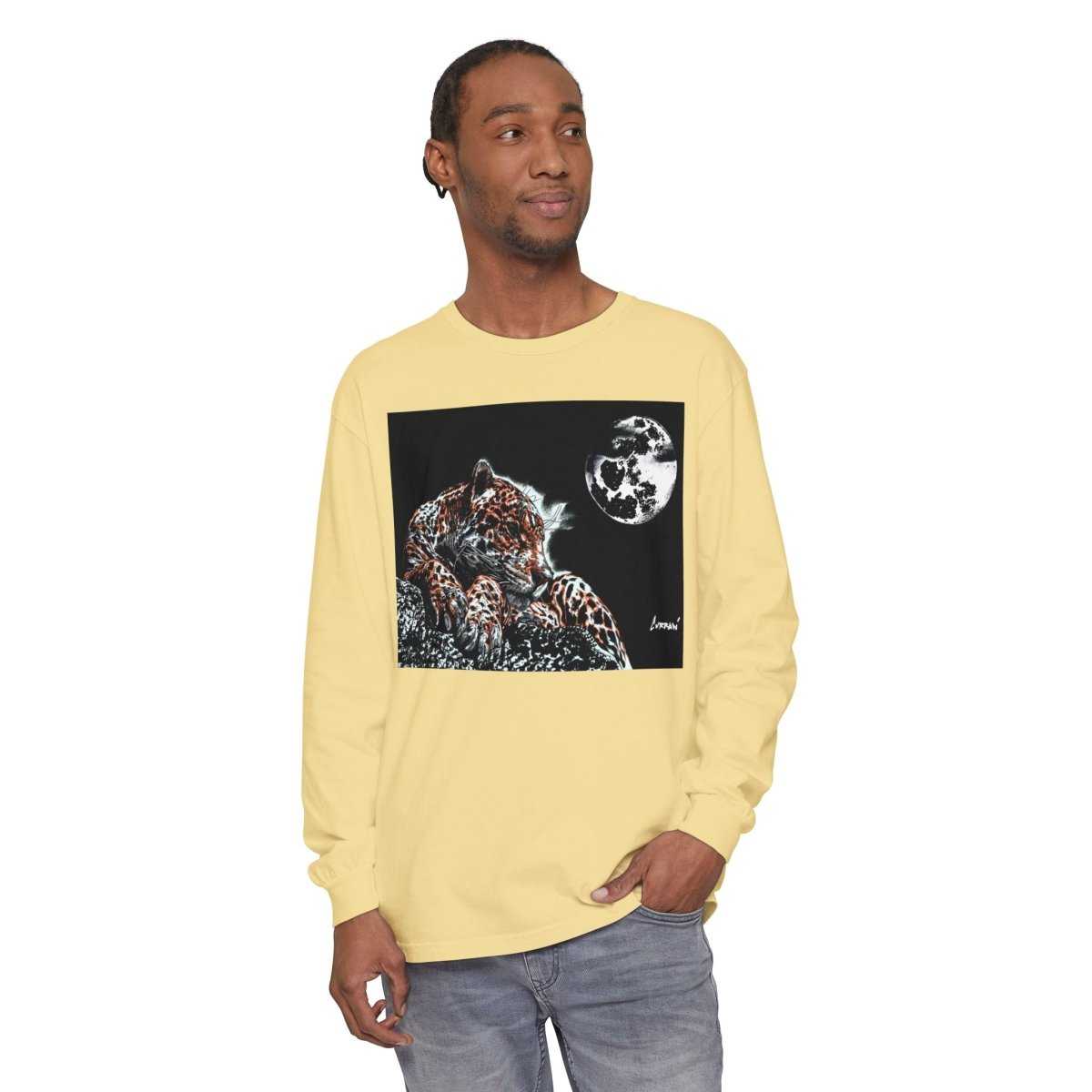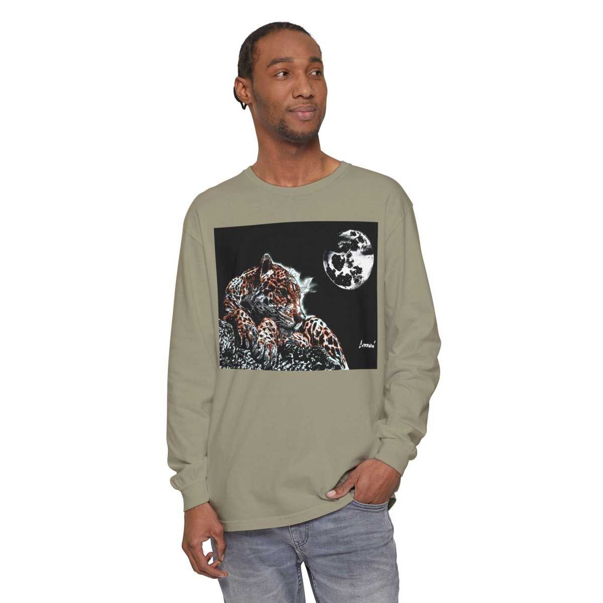 Leopard Long Sleeve T-Shirt - Unisex Garment-Dyed Nature Tee featuring the original hand drawn jungle cat wall art poster by Kris Curran.