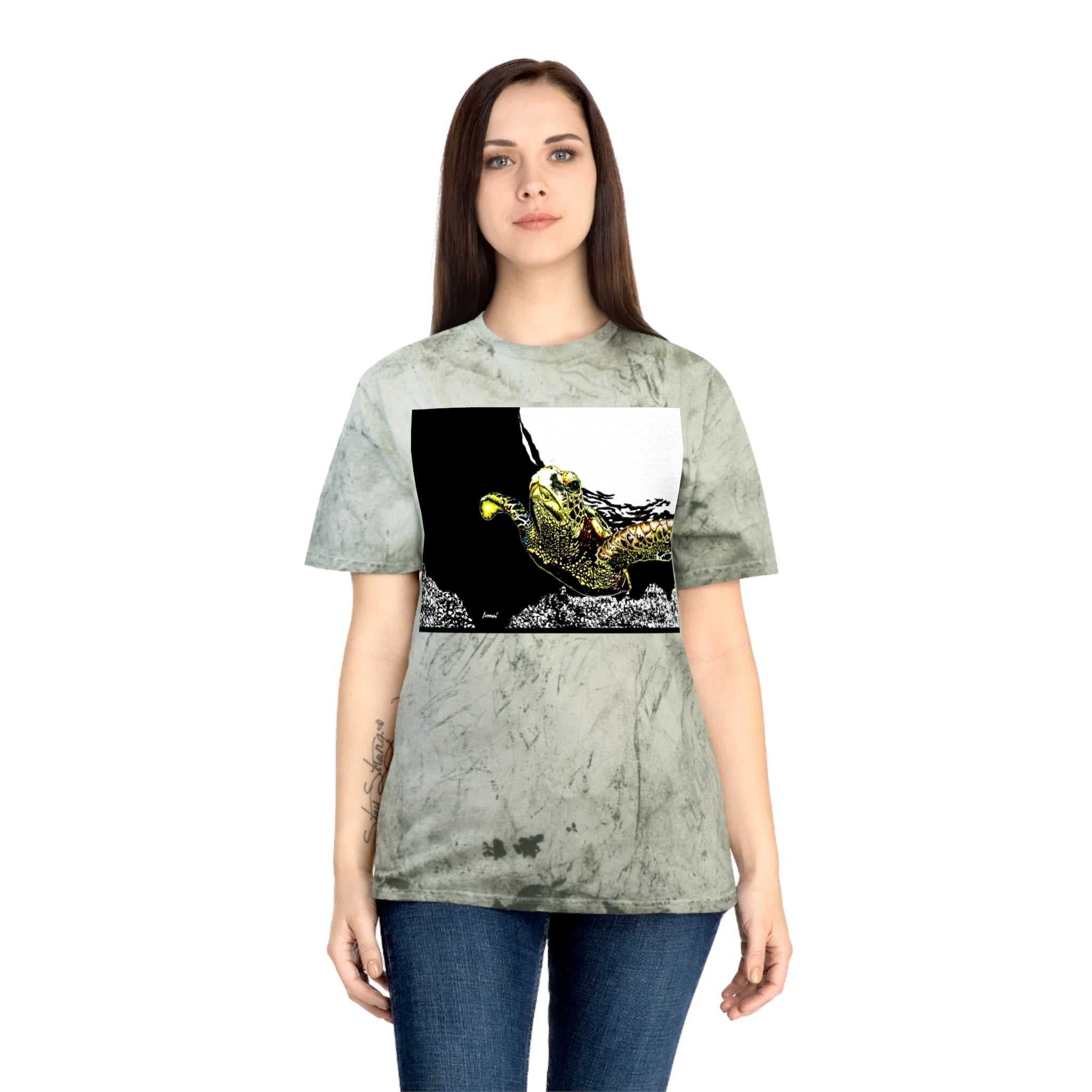 Add a pop of color to your wardrobe with this Unisex Color Blast T-Shirt featuring a hand-drawn art of a sea turtle. Perfect for those who love vibrant and unique designs. Great for casual outings, beach days, and summer holidays.
