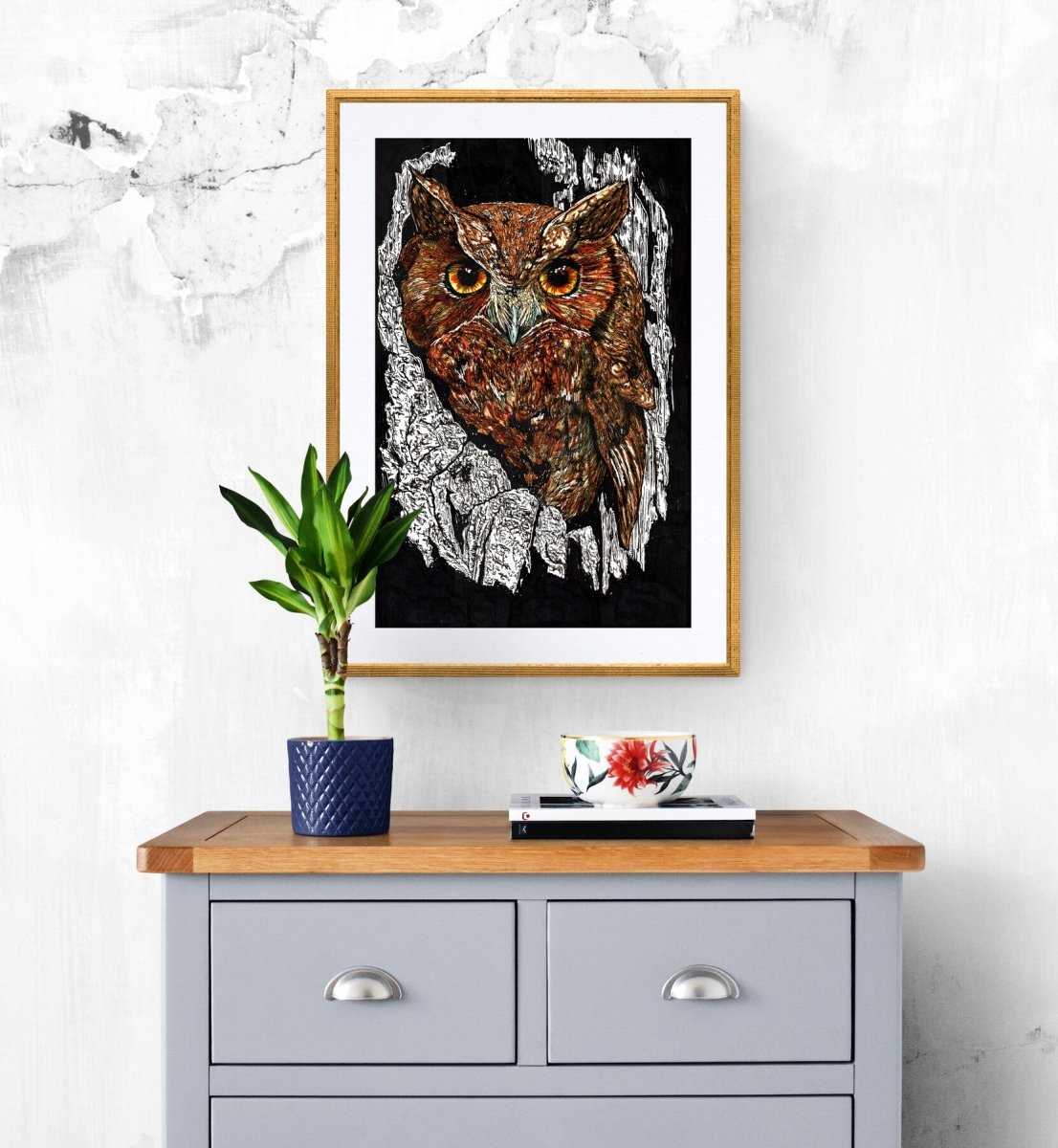 "Kindred Spirits – Depicting Original Hand-Drawn Two Owl 2 Wall Art Poster by Curran Artworks graphic artist Kris Curran."