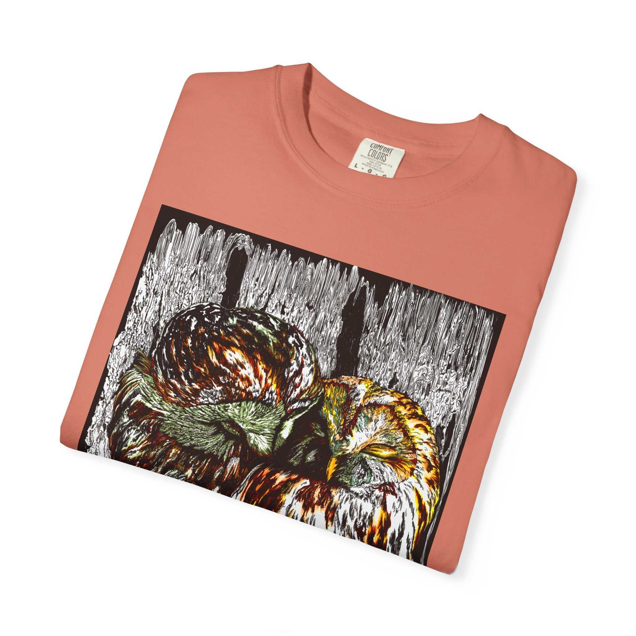 Discover the magic of nature with our Owls in a Tree Unisex Garment-Dyed T-Shirt! Get yours now for a touch of whimsical style.
