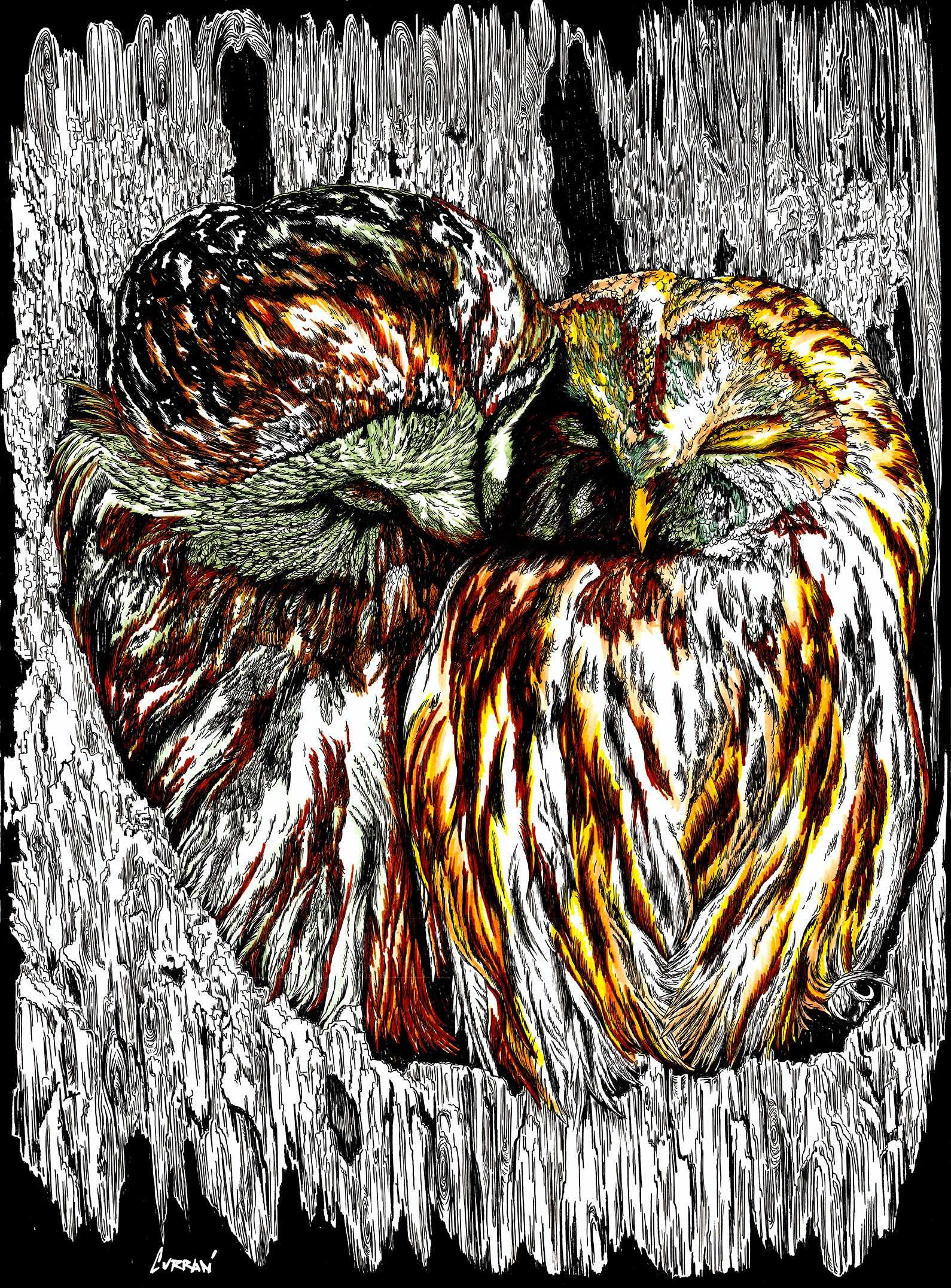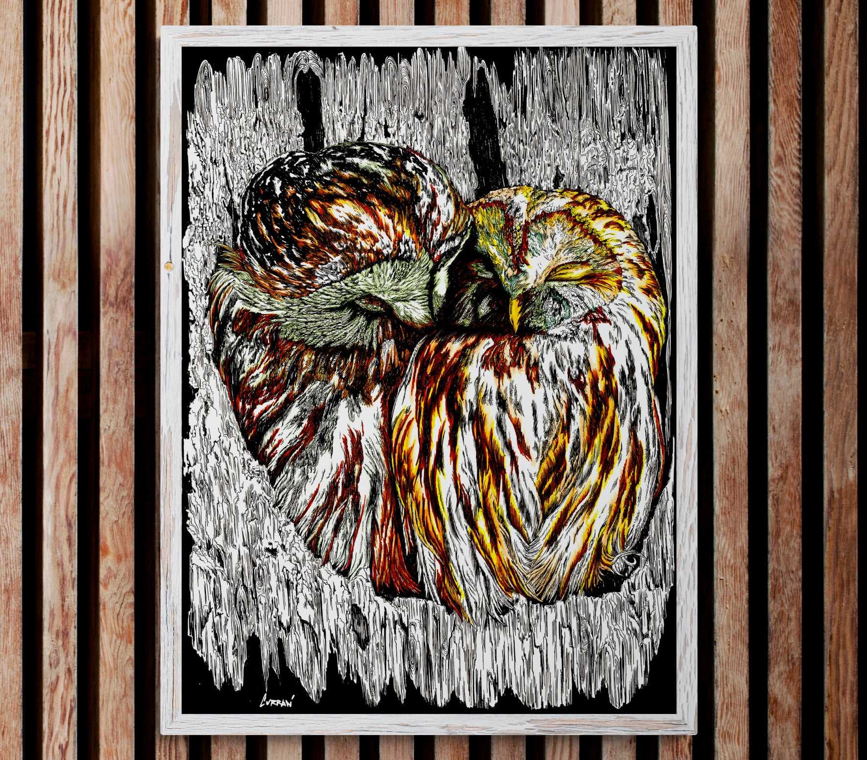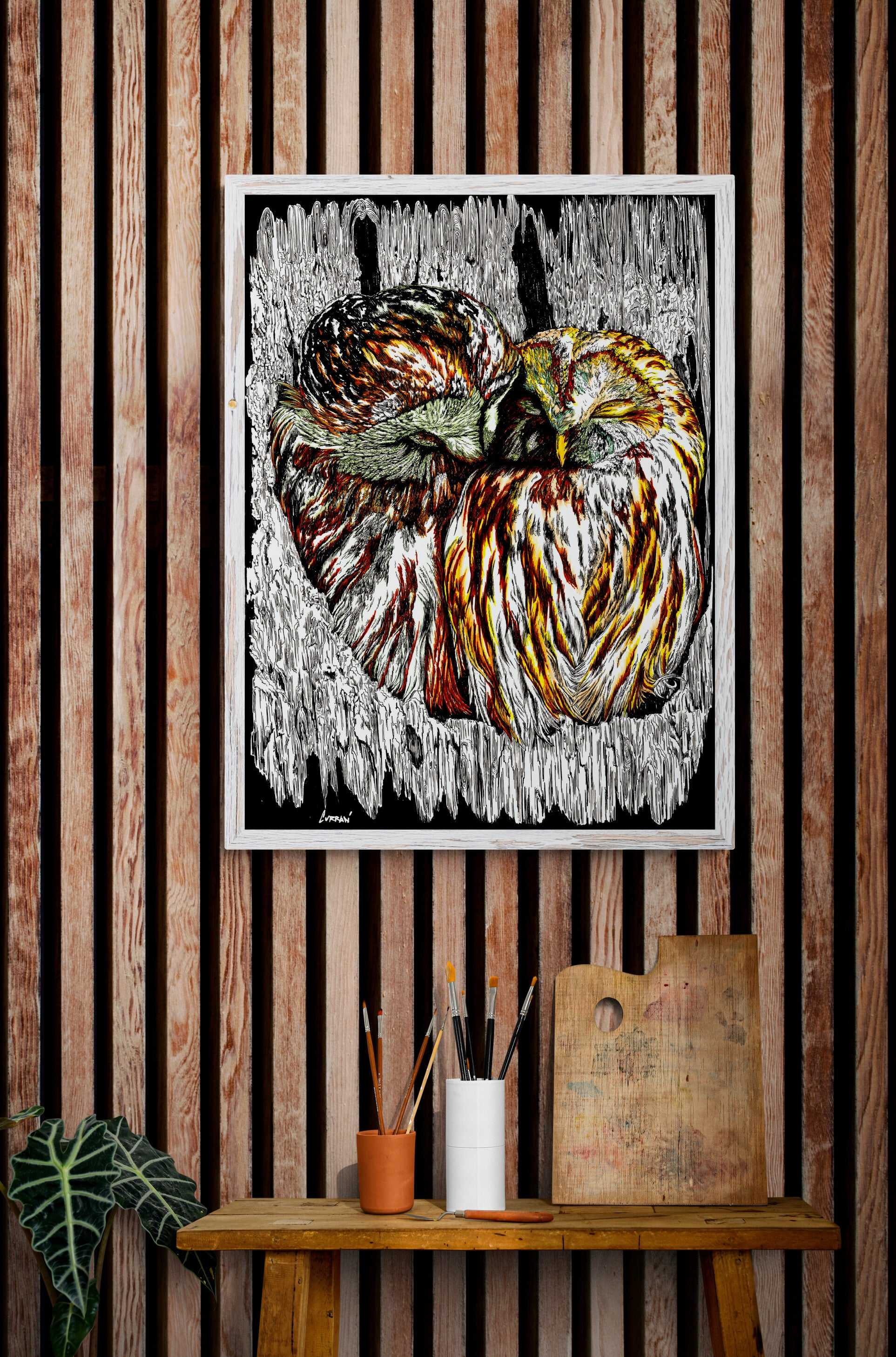 Each feather is meticulously rendered in fine ink lines, giving lifelike texture and depth to the owls' soft plumage. Warm earth tones, rich browns, and golden highlights bring the owls to life, while their expressive eyesâone curious, the other wiseâdraw you into their shared moment of serene stillness. Nestled side-by-side under a canopy of leaves, the owls are framed by twisted branches, creating a natural cradle that suggests both safety and intimacy.