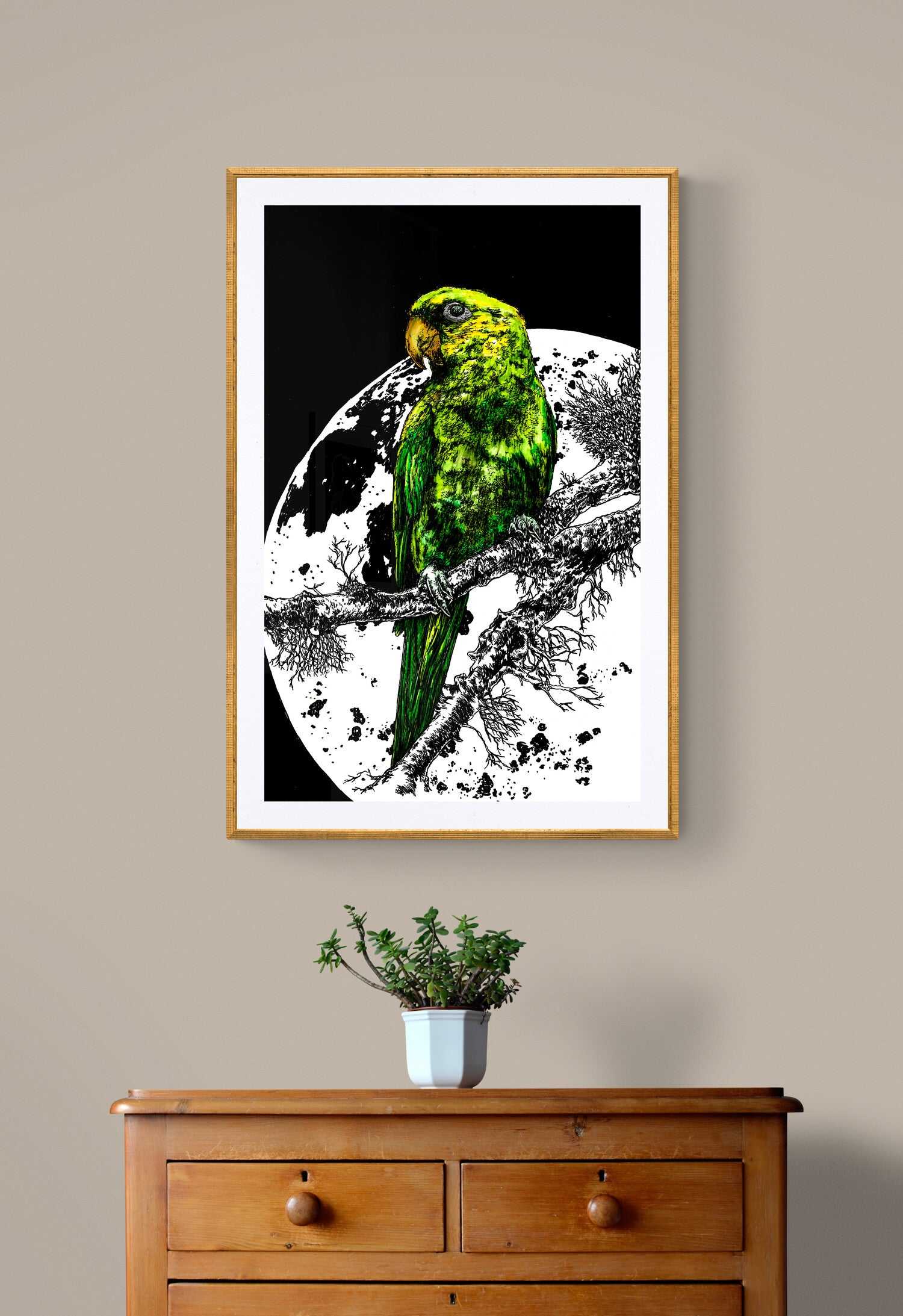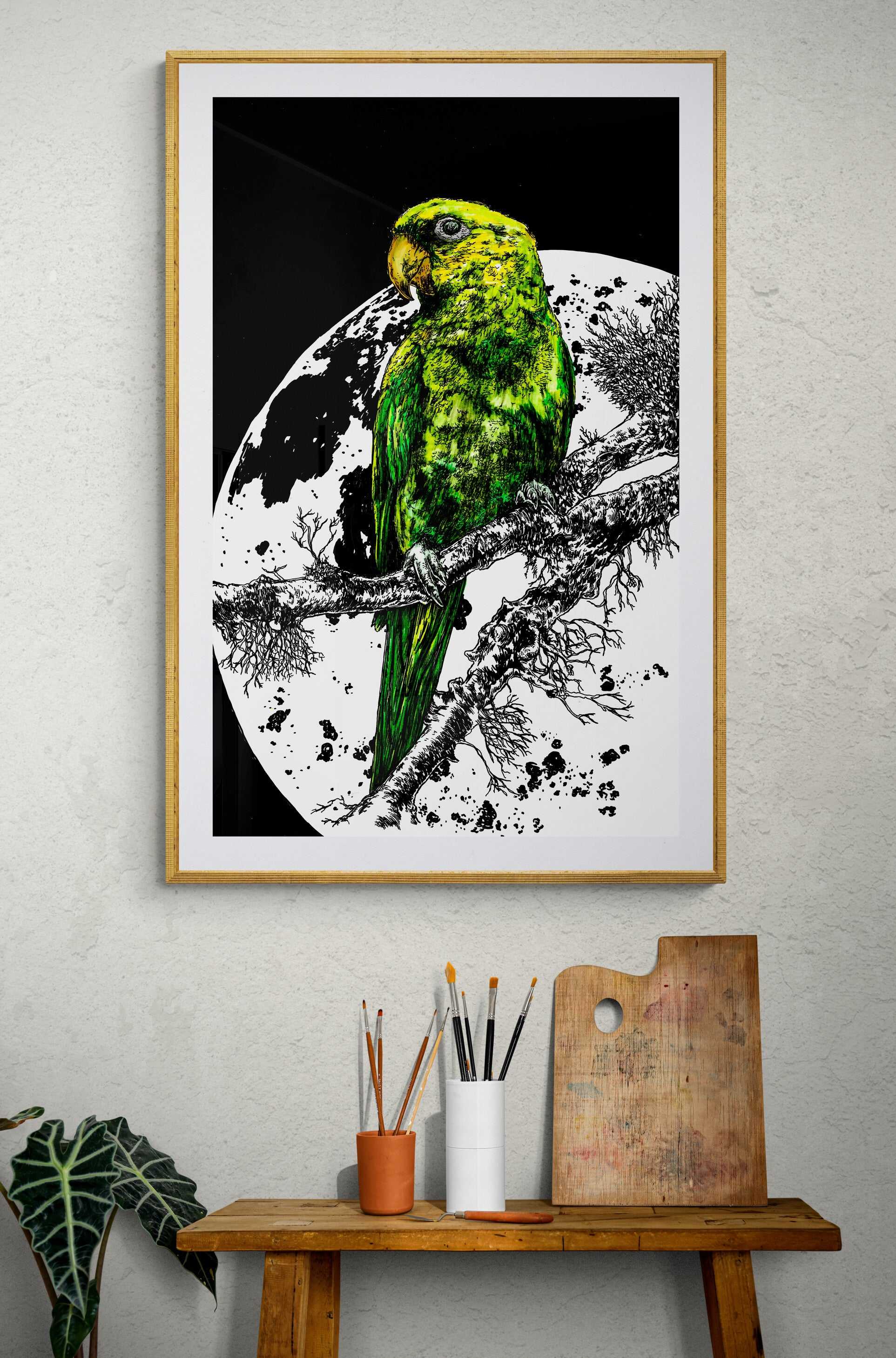 Enveloped in the serene glow of moonlight, this 11" x 17" original hand-drawn wall art poster by Kris Curran brings to life a vibrant green parrot in exquisite detail. Crafted on smooth Bristol board, the artwork features delicate India ink linework paired with the lush, radiant colors of Copic alcohol ink pens, capturing both the bird’s vivid plumage and the mystical ambiance of the night. This piece is a harmonious blend of nature’s brilliance and quiet mystery—an elegant tribute to the enchanting beauty found in twilight moments and the spirited soul of the parrot.