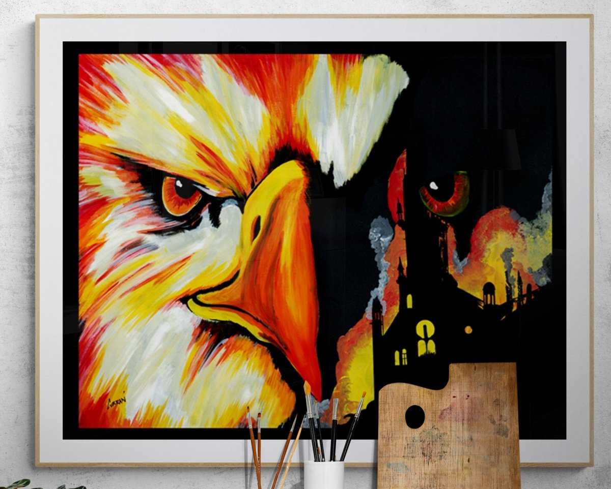 Curran’s signature style blends vivid realism with expressive flourishes, making this artwork not only visually captivating but emotionally stirring. The phoenix’s upward gaze, outstretched wings, and swirling flames tell a story of resilience, courage, and the infinite cycle of creation.