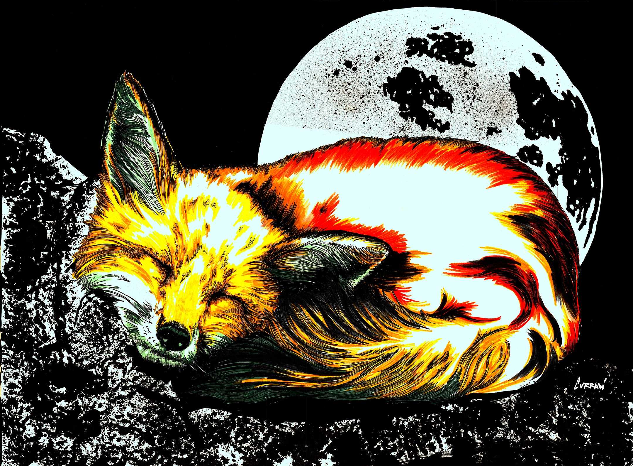 The red fox—alert, graceful, and intelligent—is brought to life with vibrant shades of russet, amber, and snowy white. Its piercing eyes, rendered with masterful ink work, seem to follow the viewer with a quiet intensity, evoking a sense of untamed wisdom. Every hair of its fur is delicately inked and shaded, blending warm tones and cool shadows to highlight the fox’s sleek form and expressive face.