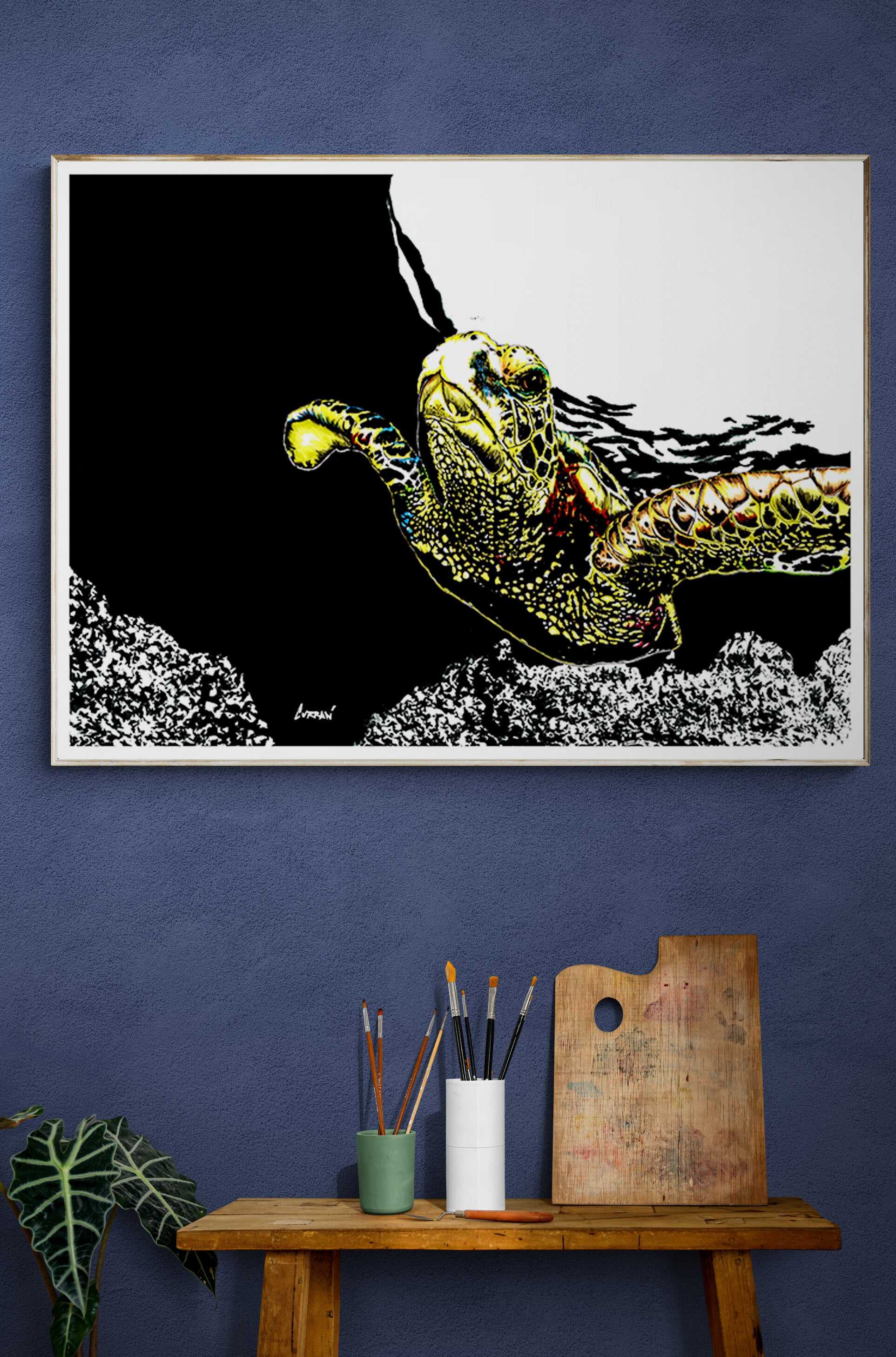 The sea turtle, a symbol of wisdom, endurance, and harmony with nature, is depicted here with a sense of peaceful motion and quiet dignity. Floating effortlessly across the composition, it invites the viewer into a moment of calm — a reminder of the slow, purposeful beauty that exists beneath the waves.