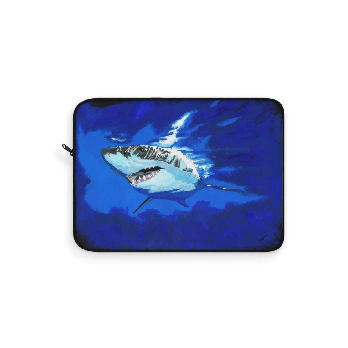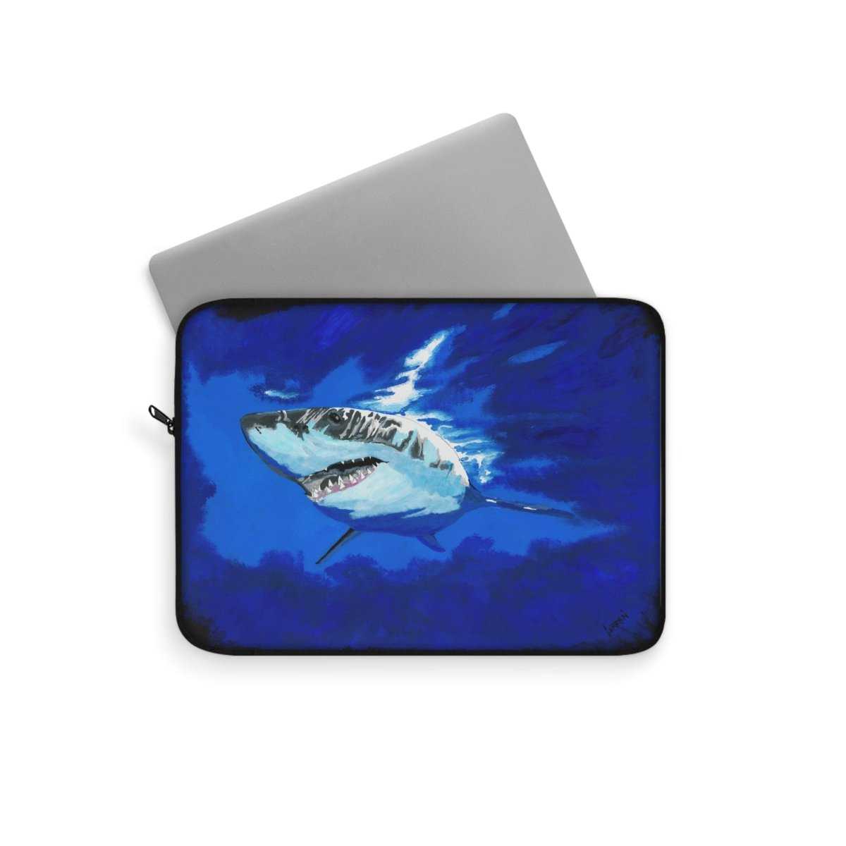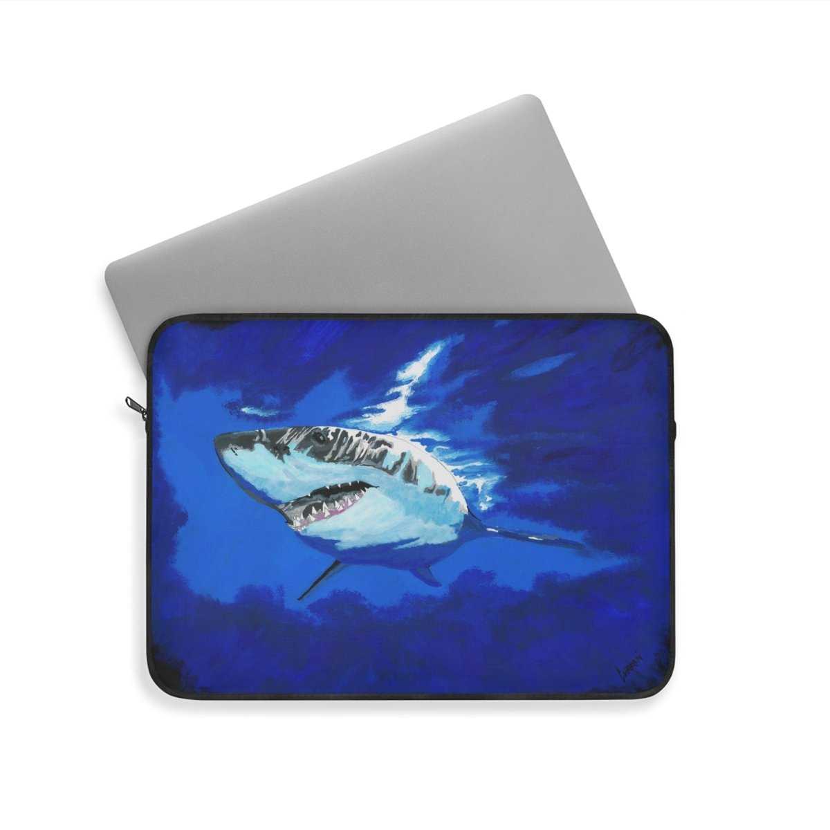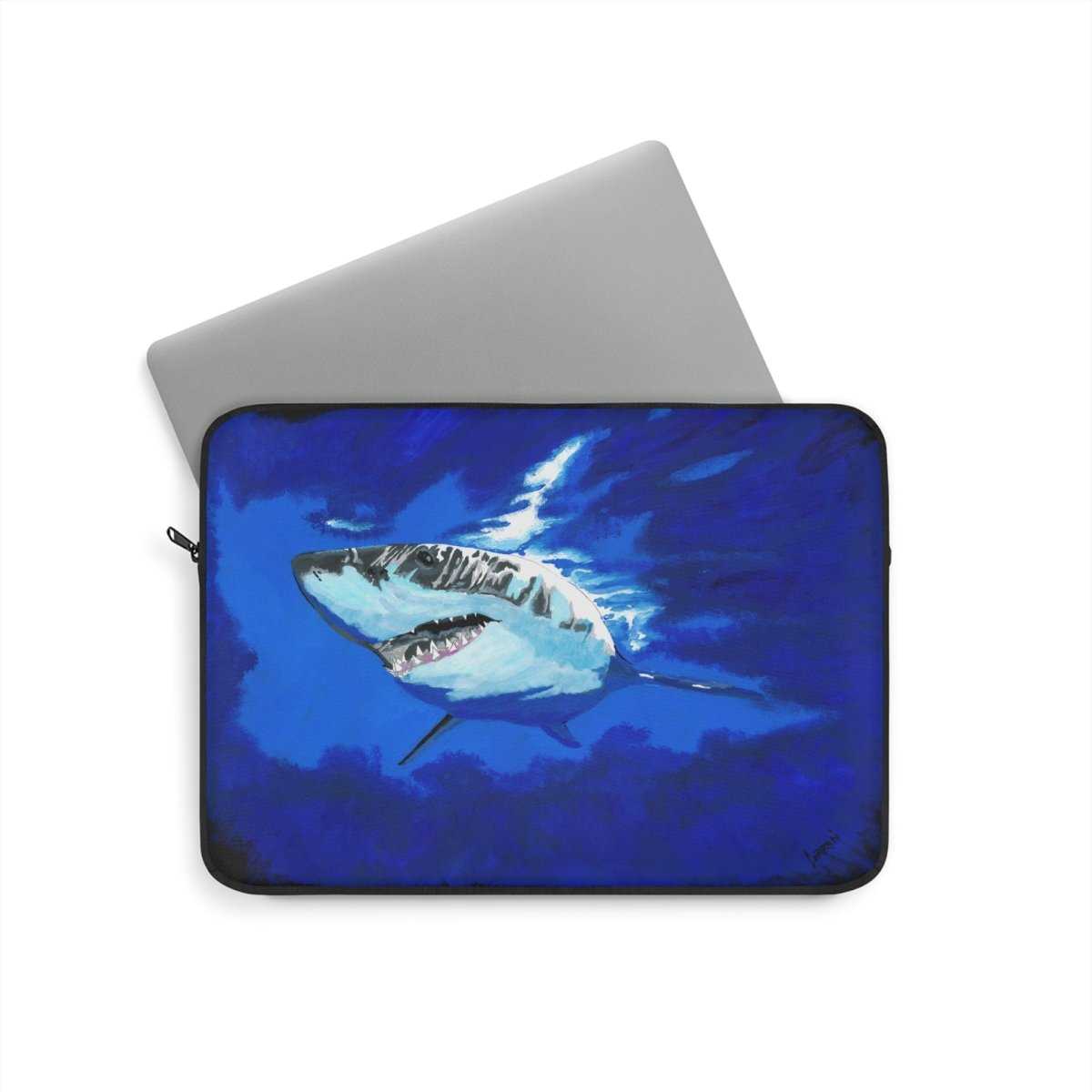 Shark Hand Painted Art Laptop Sleeve - Ocean Vibes Tech Accessory showcasing the original hand painted shark wall art poster created by artist Kris Curran.