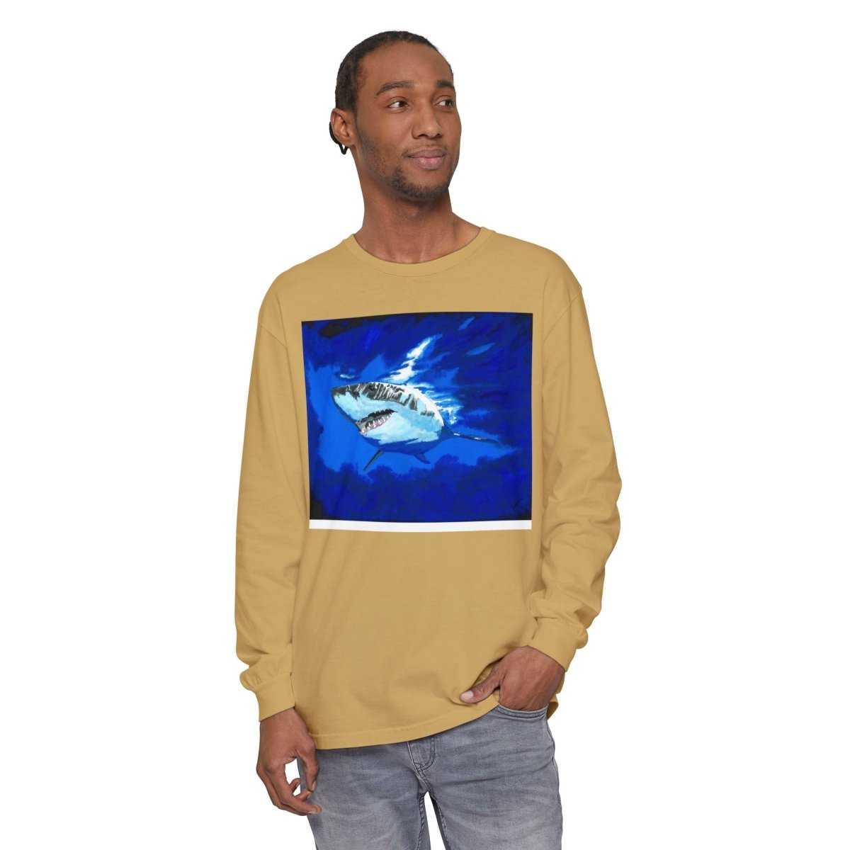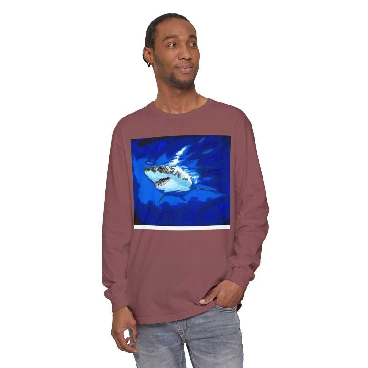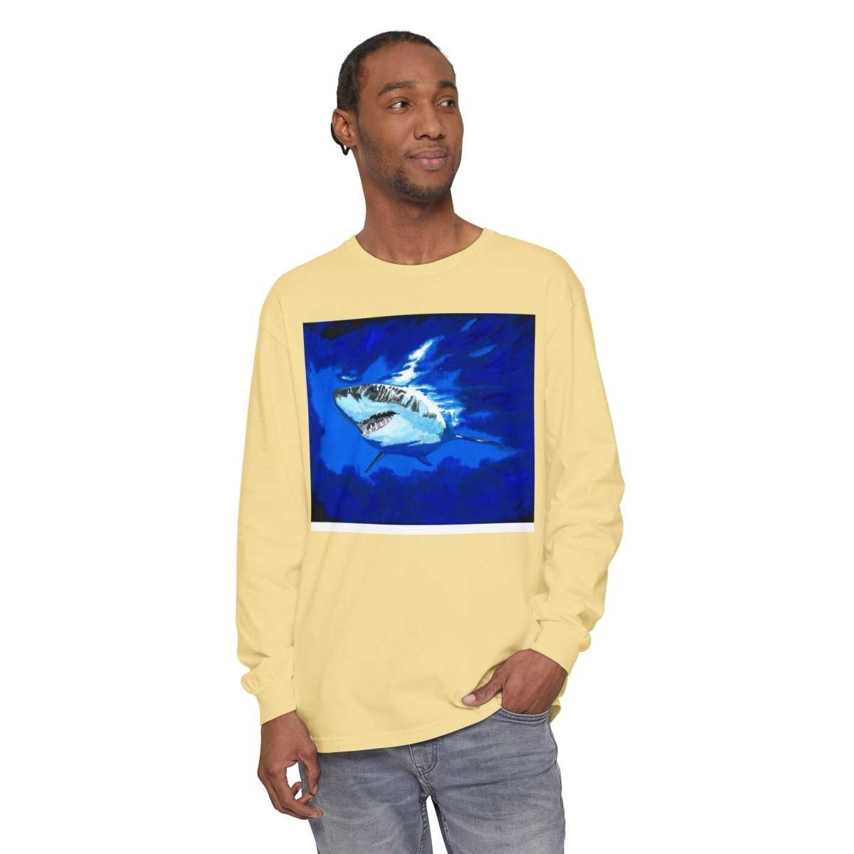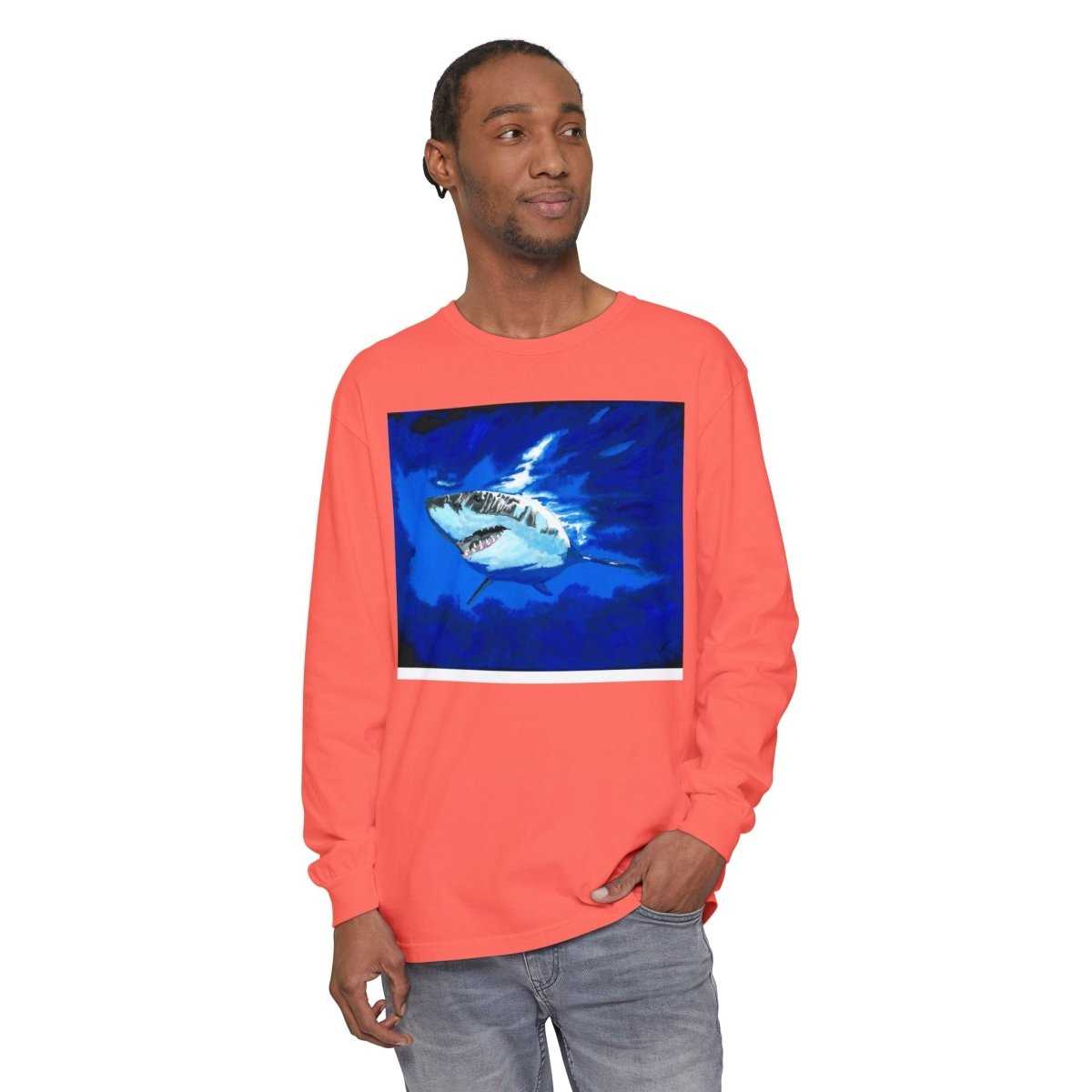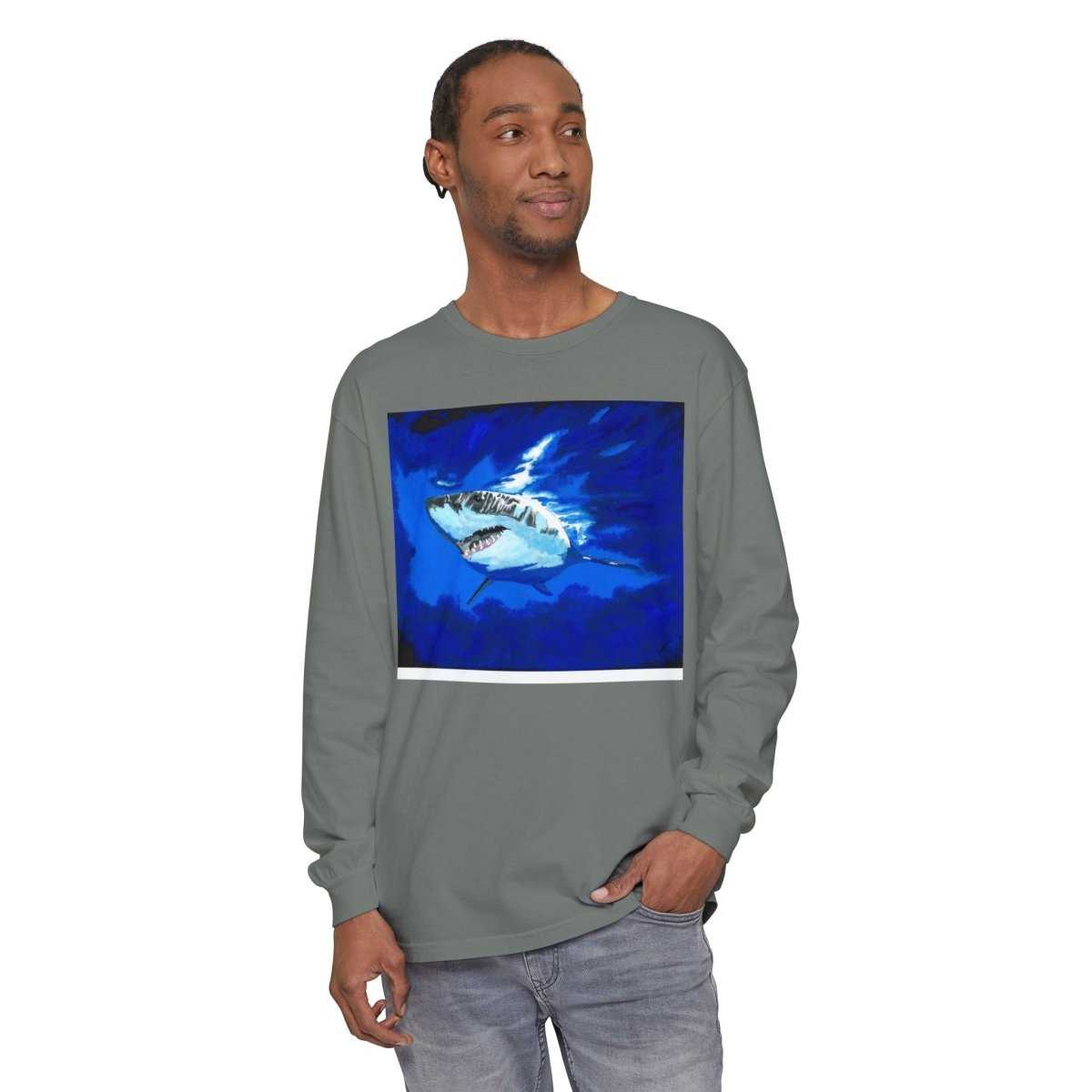 Stay stylish and comfortable with this Shark Long Sleeve T-Shirt, featuring a shark design perfect for beach lovers. This unisex tee is ideal for casual outings or relaxing by the shore. Great for adults looking for a durable and soft garment-dyed fabric.