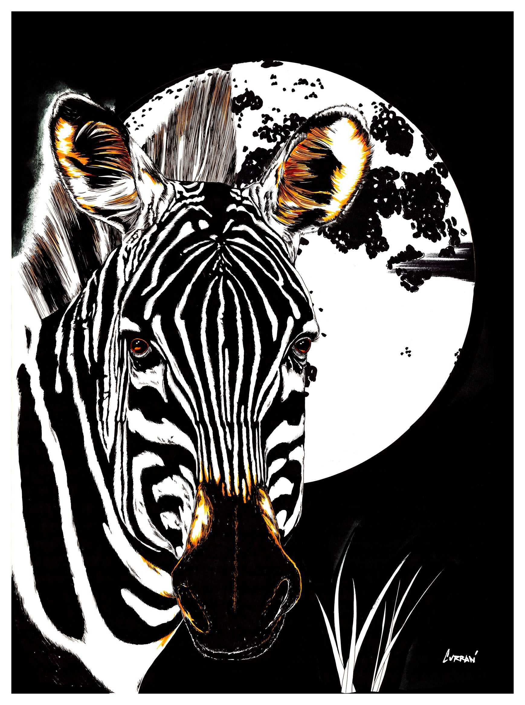 Crafted with meticulous care using India ink pens and Copic alcohol-colored ink pens on premium Bristol board paper, every line and shade is thoughtfully placed to convey the zebraâs natural elegance and peaceful presence. The soft moonlight spills over the zebraâs form, enhancing the contrast between light and shadow, while subtle hues of midnight blue, lavender, and silvery grey breathe dimension into the nighttime landscape.